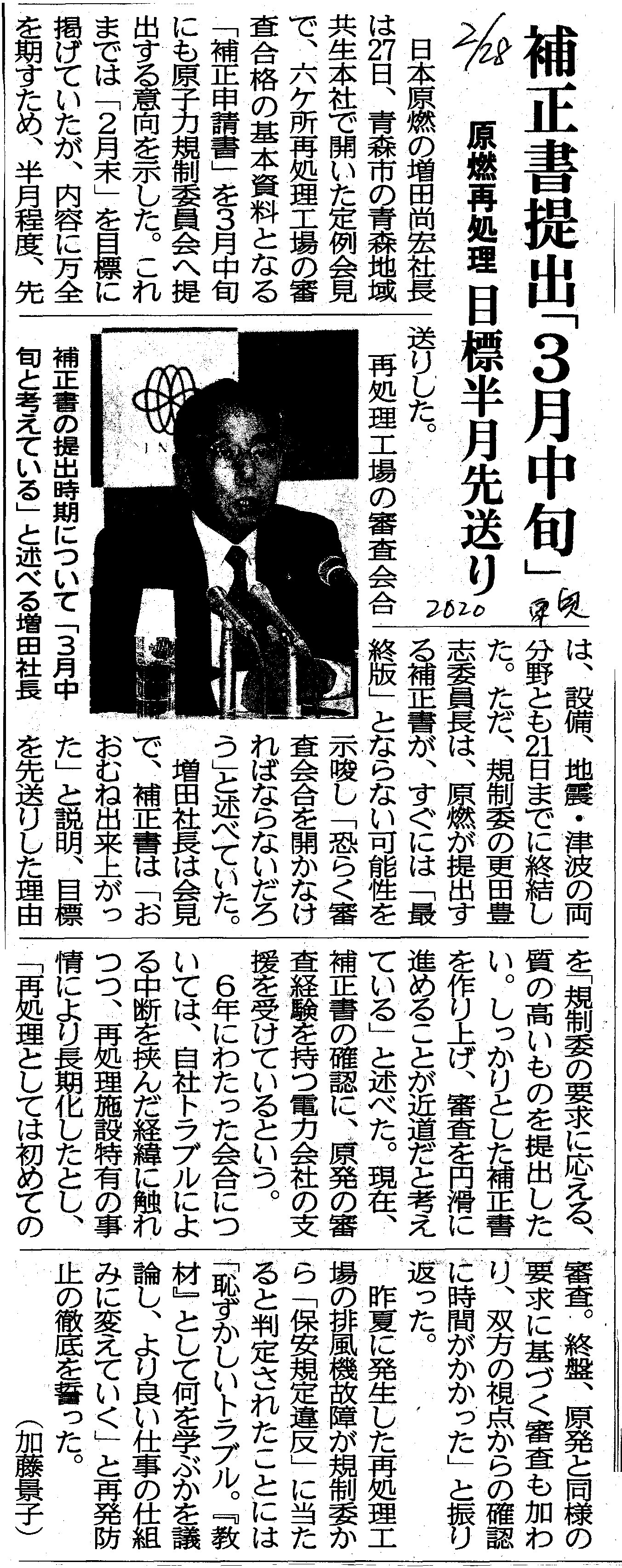 | [2020_02_28_04]補正書提出「3月中旬」 原燃再処理 目標半月先送り(東奥日報2020年2月28日) |