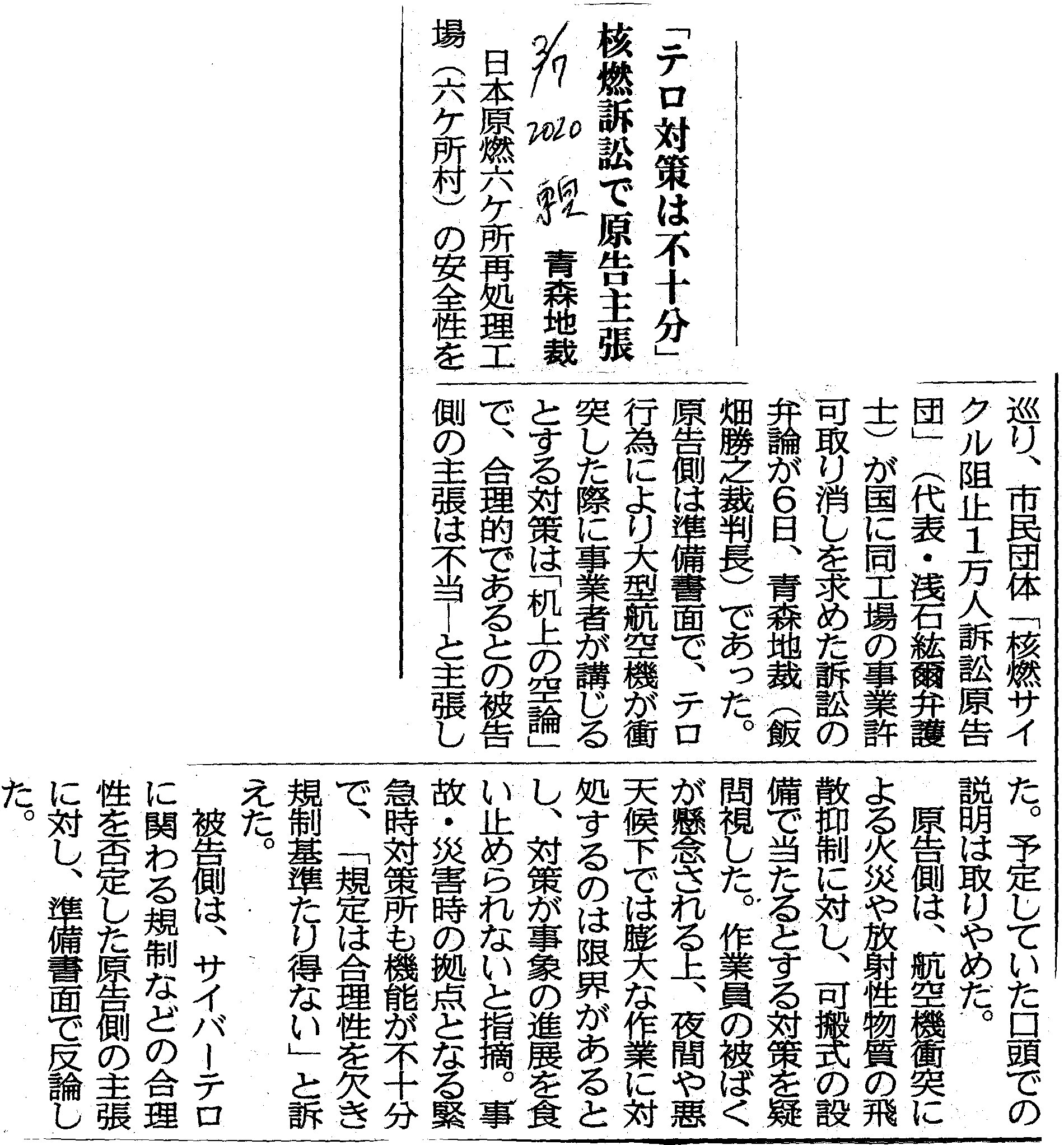 | [2020_03_07_01]「テロ対策は不十分」核燃訴訟で原告主張 青森地裁(東奥日報2020年3月7日) |