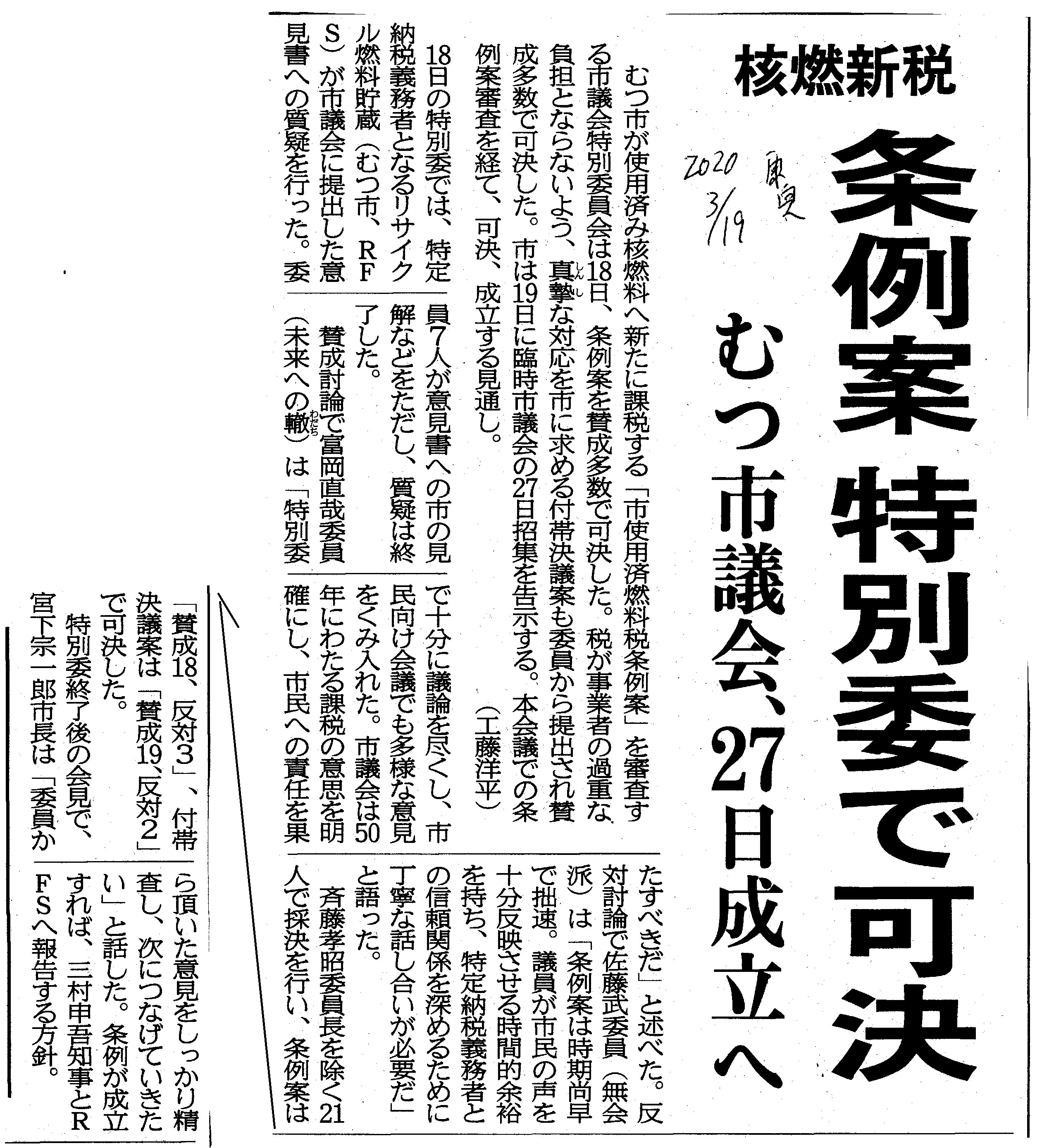 | [2020_03_19_05]核燃新税 条例案 特別委で可決 むつ市議会、27日可決へ(東奥日報2020年3月19日) |