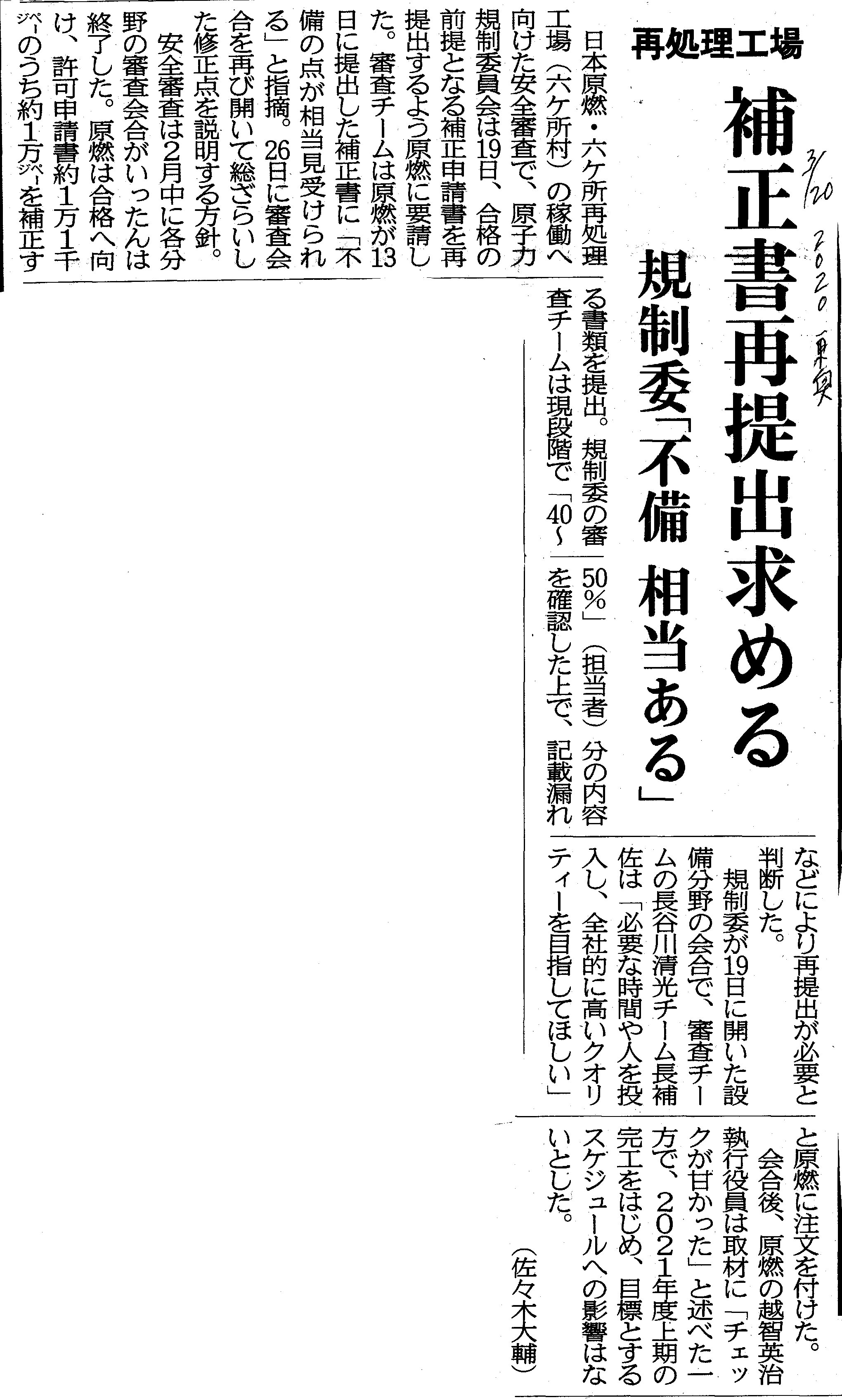 | [2020_03_20_04]再処理工場 補正書再提出求める 規制委「不備相当ある」(東奥日報2020年3月20日) |