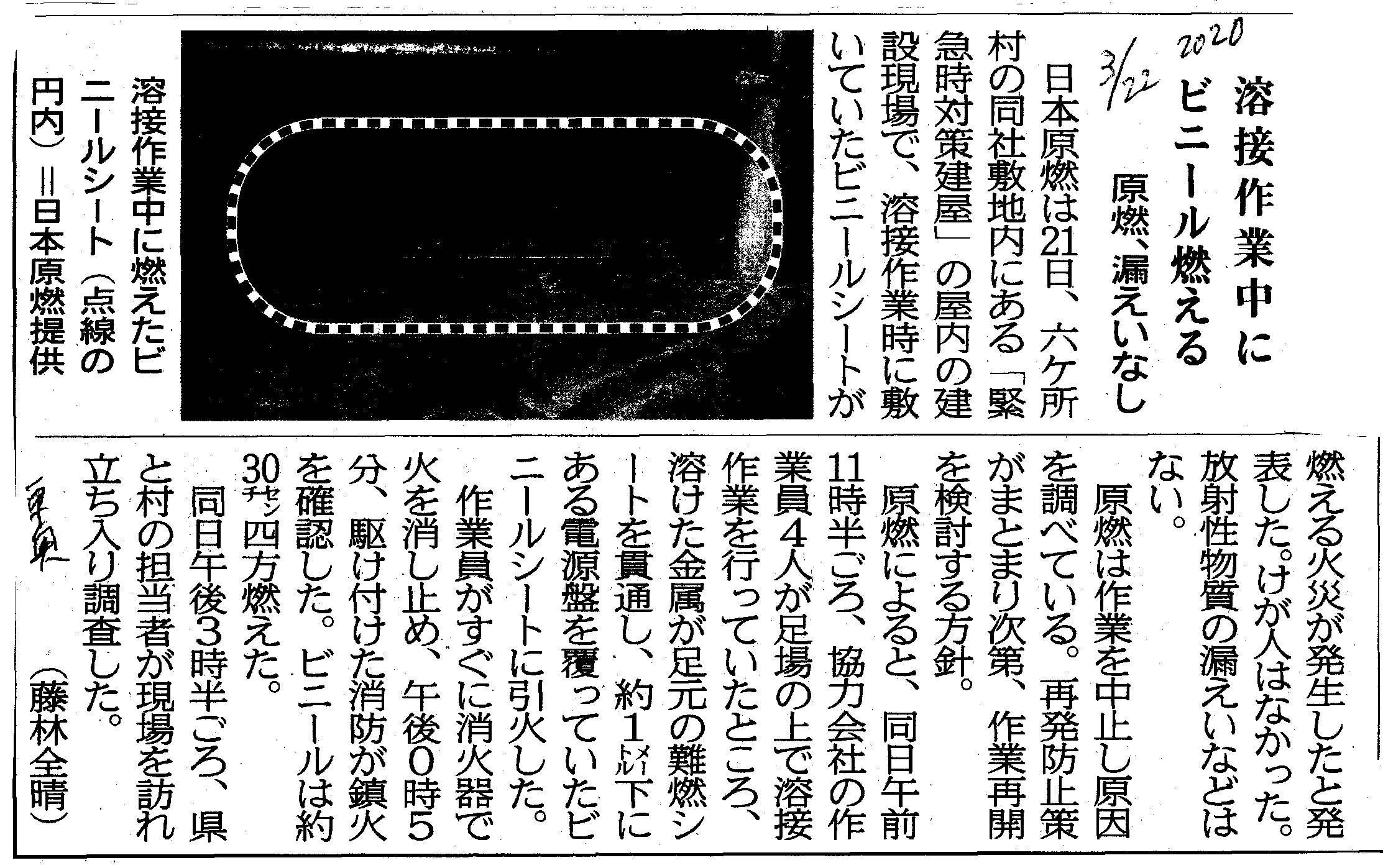 | [2020_03_22_01]溶接作業中にビニール燃える 原燃、漏えいなし(東奥日報2020年3月22日) |