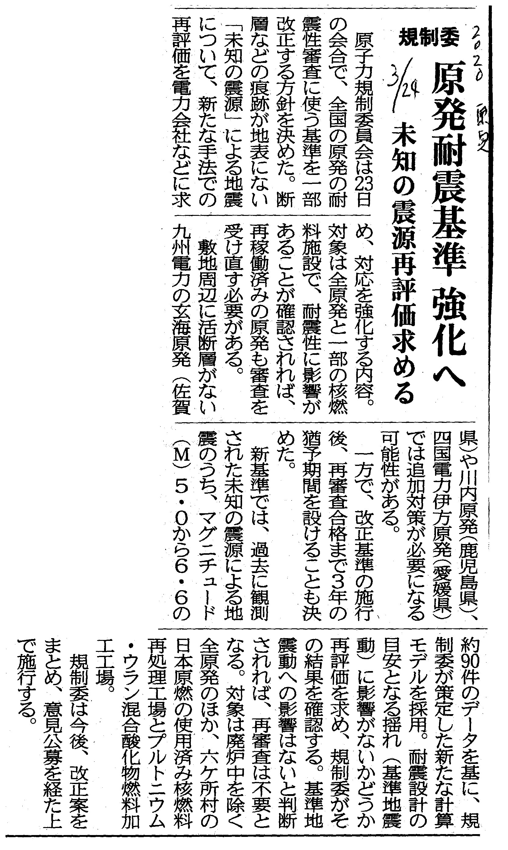 [2020_03_24_08]規制委 原発耐震基準 強化へ 未知の震源再評価求める(東奥日報2020年3月24日)