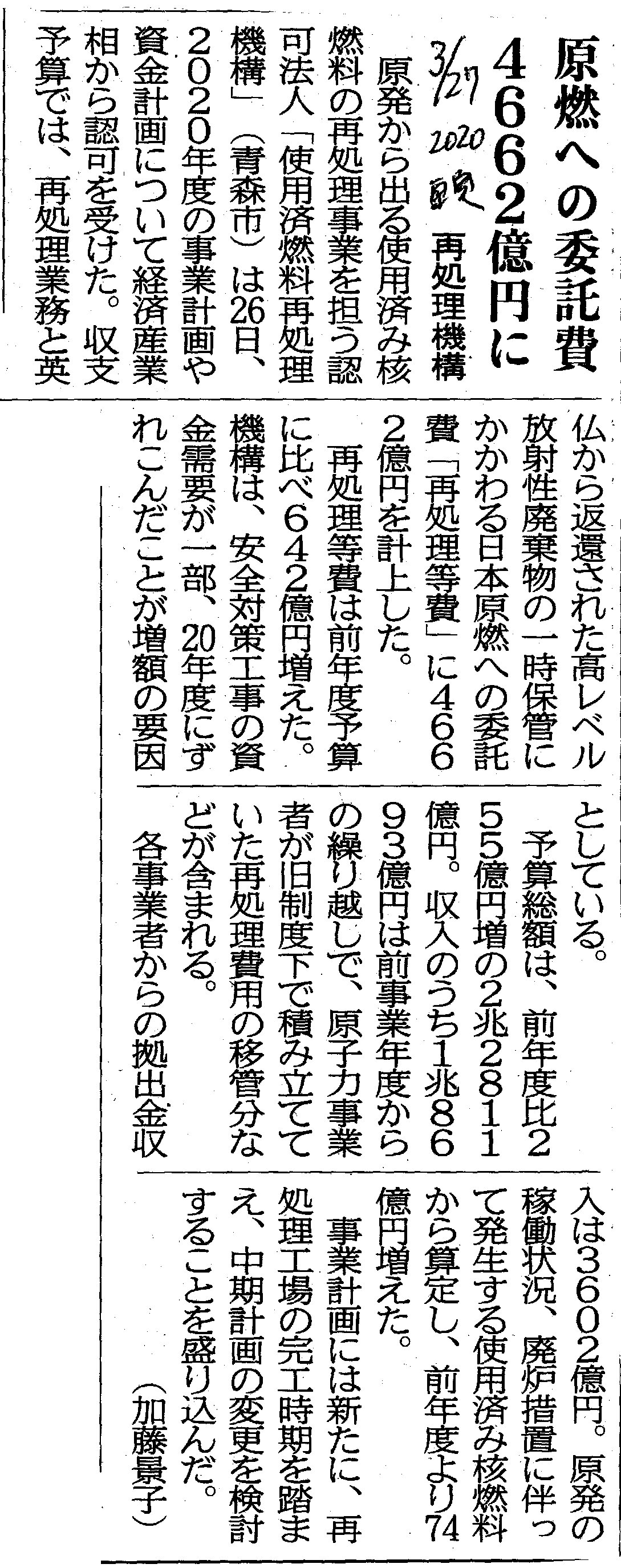| [2020_03_27_10]原燃への委託費 4662億円に 再処理機構(東奥日報2020年3月27日) |
