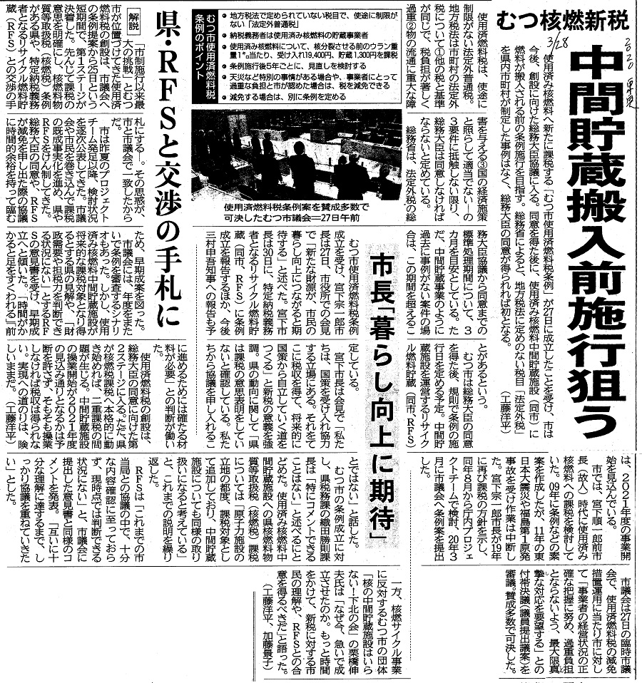 | [2020_03_28_03]むつ核燃新税 中間貯蔵搬入前施工を狙う 市長「暮らし向上に期待」県・RFSと交渉の手札に(東奥日報2020年3月28日) |