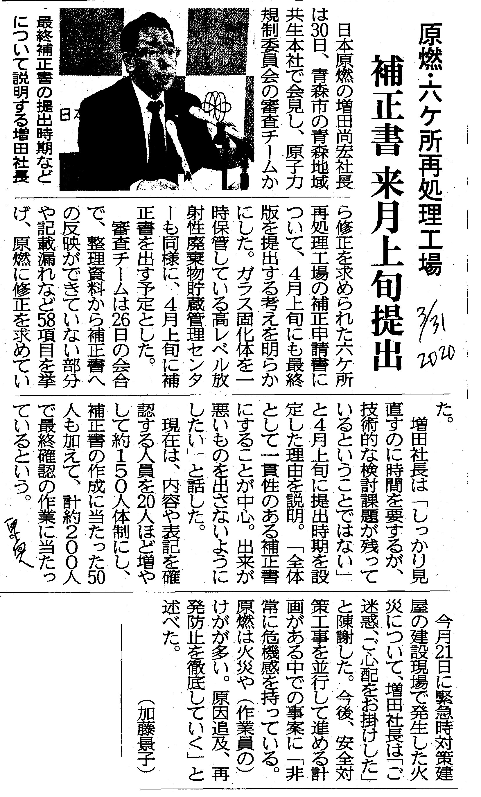 | [2020_03_31_05]原燃・六ケ所再処理工場 補正書 来月上旬提出(東奥日報2020年3月31日) |