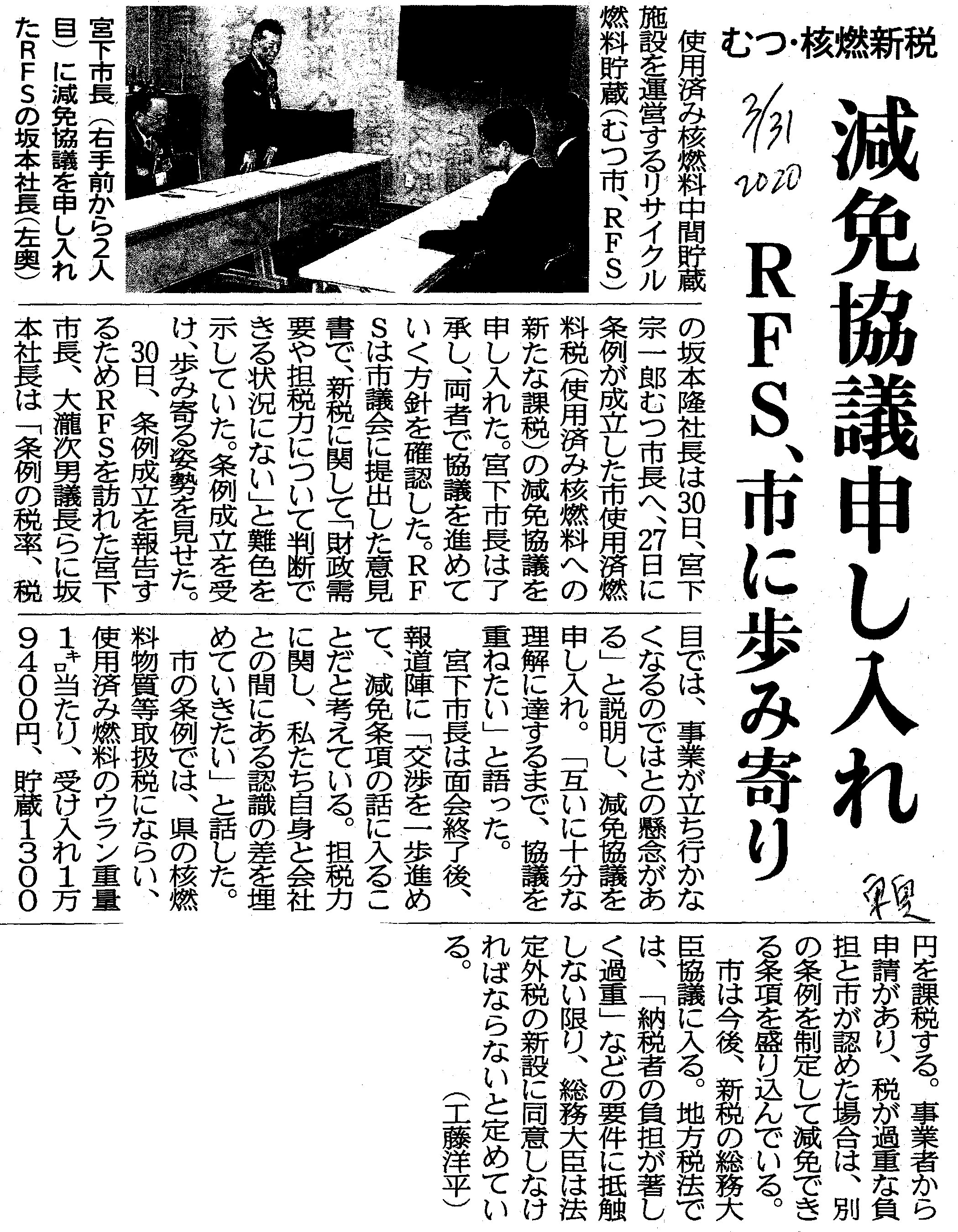 | [2020_03_31_06]むつ・核燃新税 減免協議申し入れ RFS、市に歩み寄り(東奥日報2020年3月31日) |