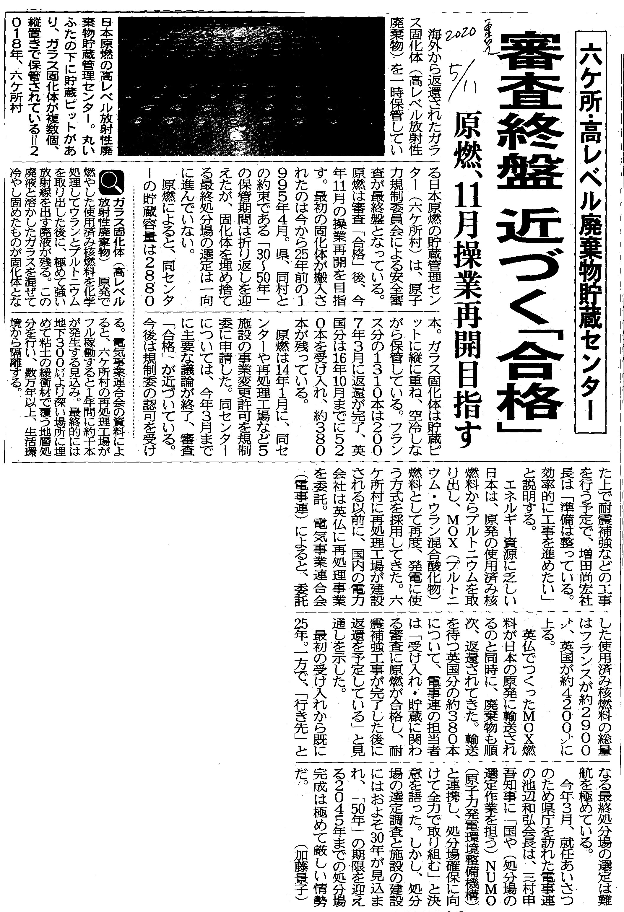 | [2020_05_11_04]六ケ所・高レベル廃棄物貯蔵センター 審査終盤 近づく「合格」 原燃、11月操業再開目指す(東奥日報2020年5月11日) |