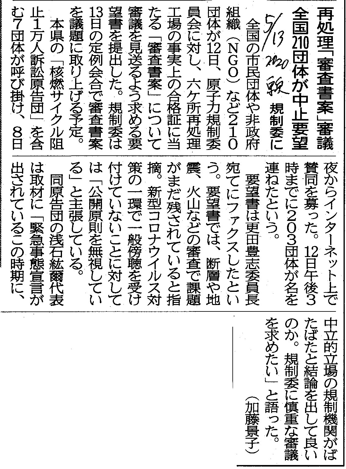 | [2020_05_13_08]再処理「審査書案」審議 全国210団体が中止要望 規制委に(東奥日報2020年5月13日) |