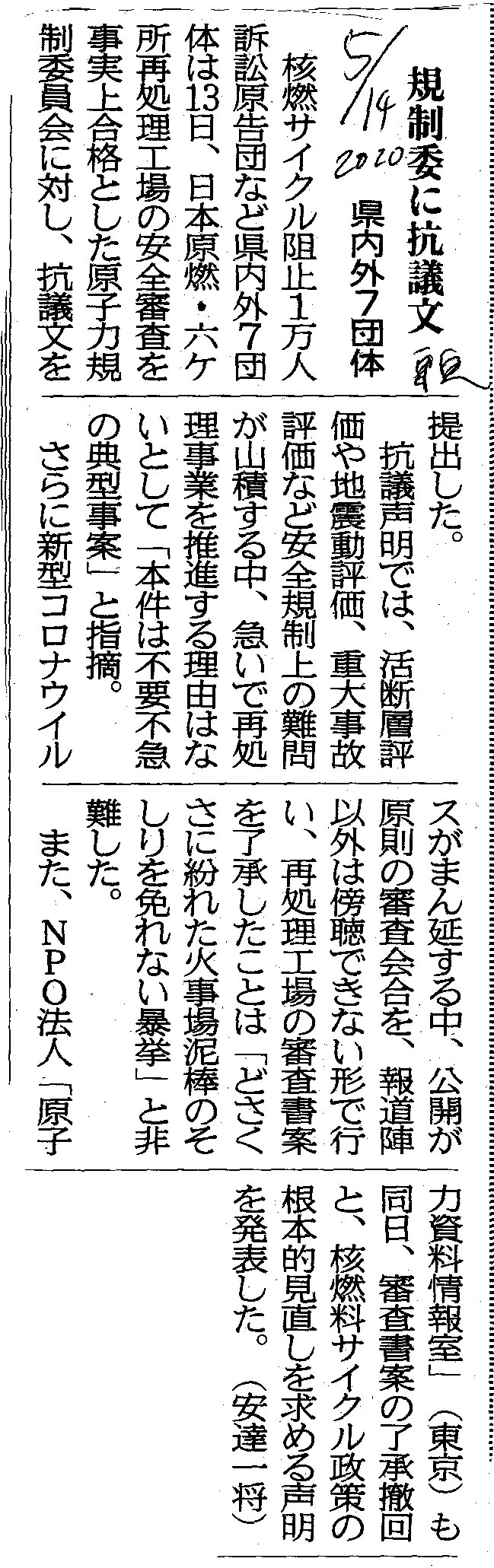 | [2020_05_14_11]規制委に抗議文 県内外7団体(東奥日報2020年5月14日) |