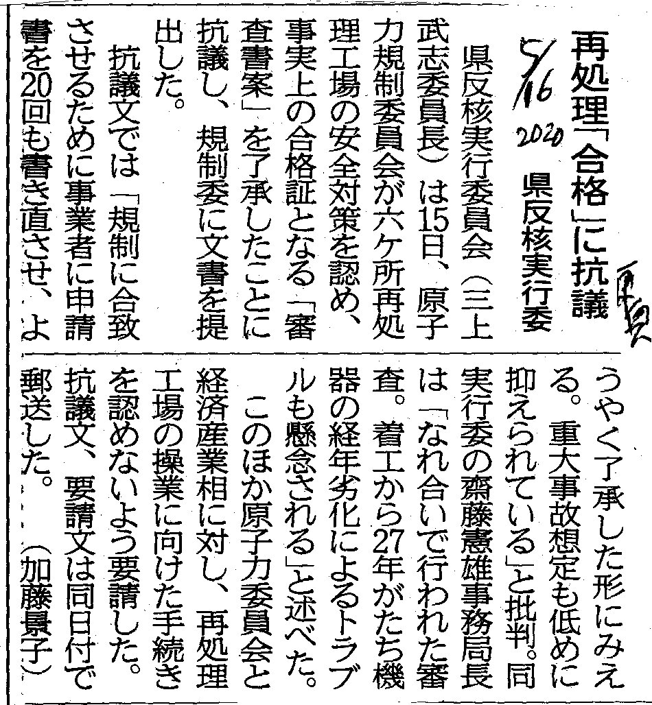 | [2020_05_16_02]再処理「合格」に抗議 県反核実行委(東奥日報2020年5月16日) |