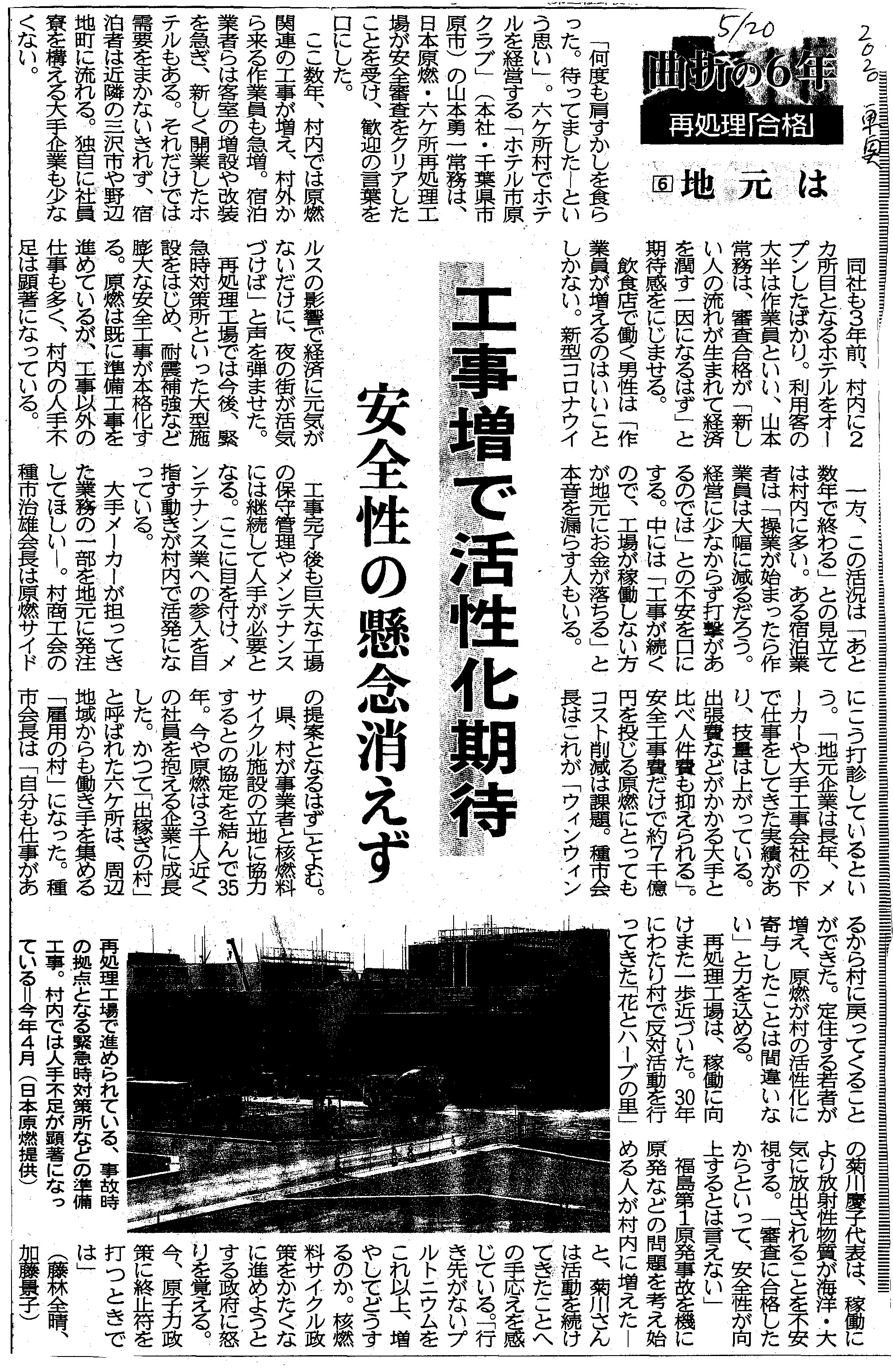 | [2020_05_20_04]曲折の6年 再処理「合格」 (6)地元は 工事増で活性化期待 安全性の懸念消えず(東奥日報2020年5月20日) |