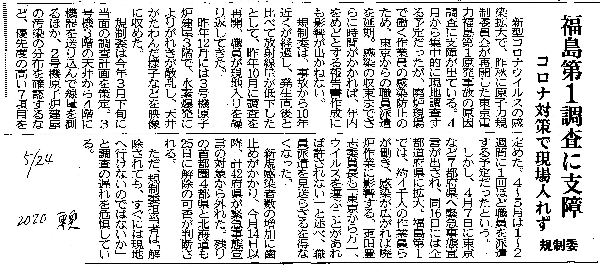 [2020_05_24_05]福島第1調査に支障 コロナ対策で現場入れず 規制委(東奥日報2020年5月24日)