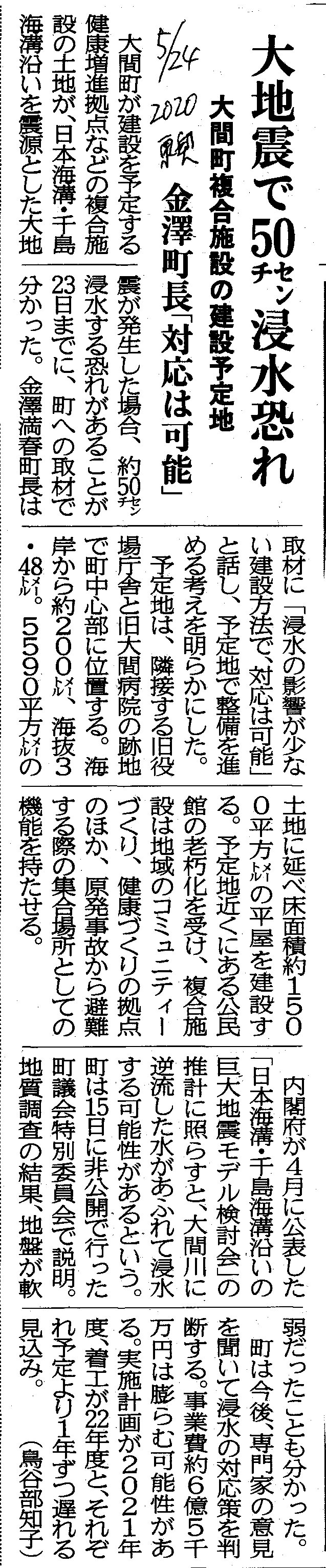 [2020_05_24_06]大地震で50センチ浸水恐れ 大間町複合施設の建設予定地 金澤町長「対応は可能」(東奥日報2020年5月24日)