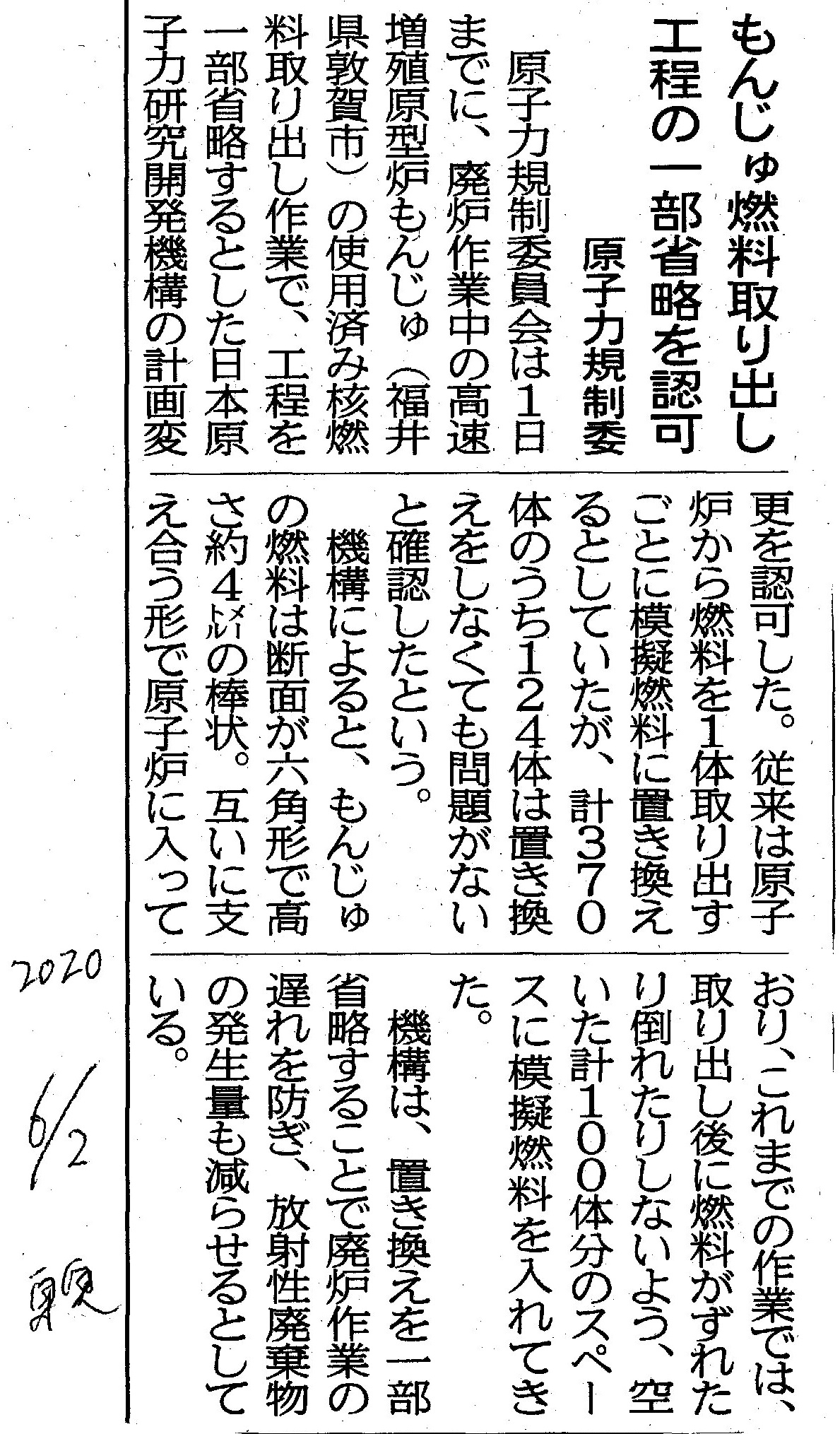 [2020_06_02_02]もんじゅ燃料取り出し 工程の一部省略を認可 原子力規制委(東奥日報2020年6月2日)
