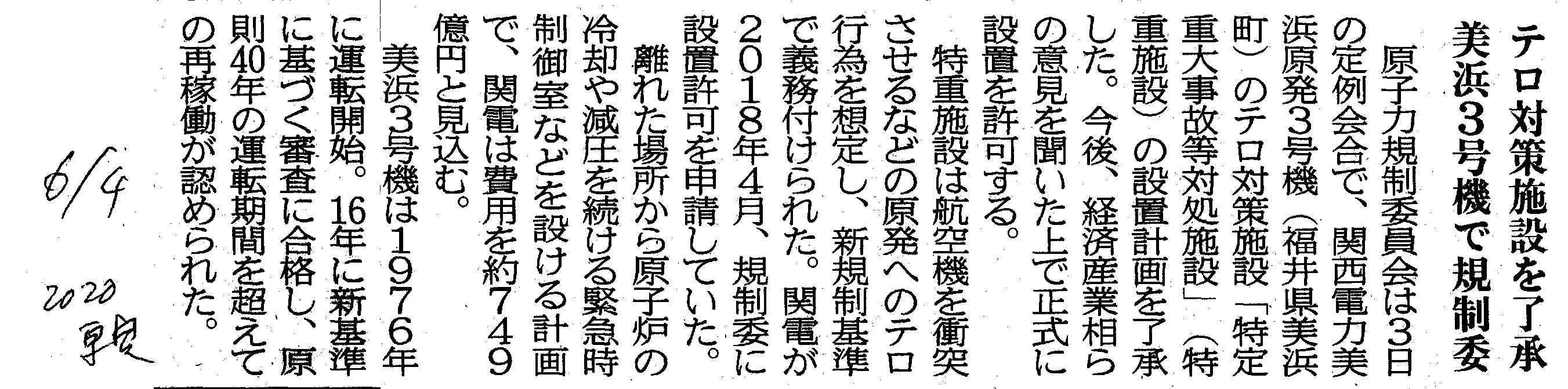 [2020_06_04_05]テロ対策施設を了承 美浜3号機で規制委(東奥日報2020年6月4日)