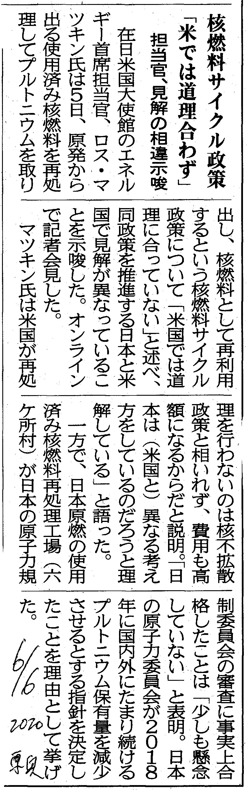 | [2020_06_06_04]核燃料サイクル政策「米で道理合わず」 担当官、見解の相違示唆(東奥日報2020年6月6日) |