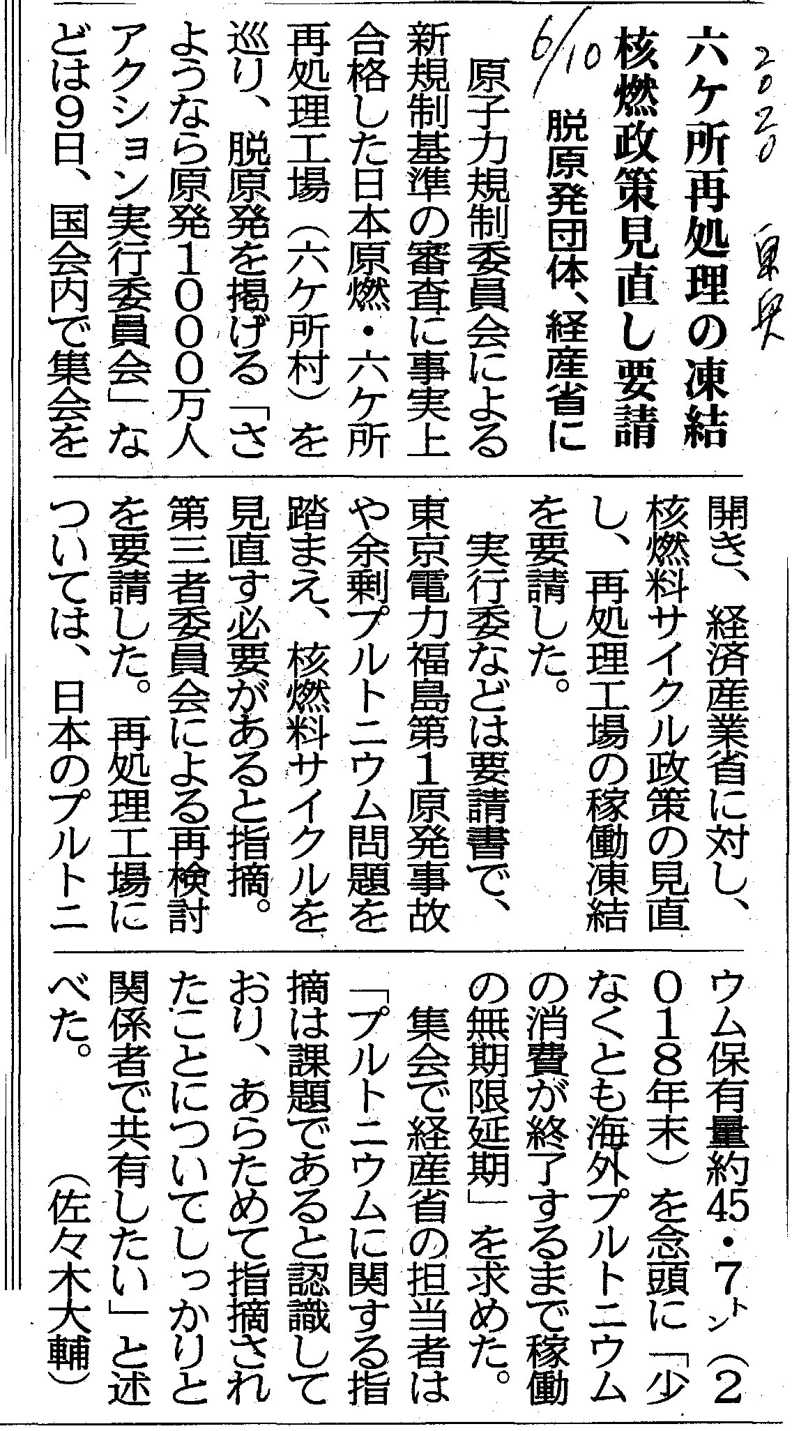 | [2020_06_10_07]六ケ所再処理の凍結 核燃政策見直し要請 脱原発団体、経産省に(東奥日報2020年6月10日) |