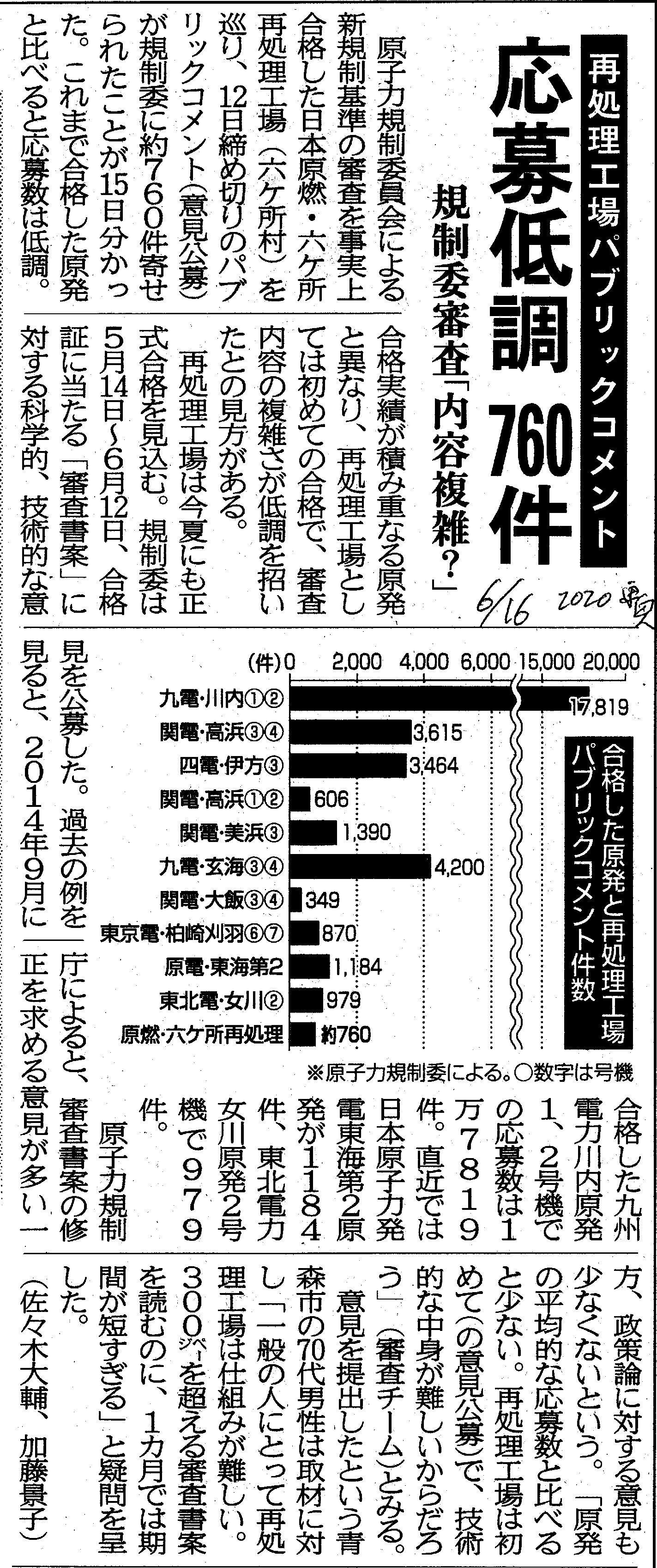 | [2020_06_16_08]再処理工場パブリックコメント 応募低調 760件 規制委審査「内容複雑?」(東奥日報2020年6月16日) |