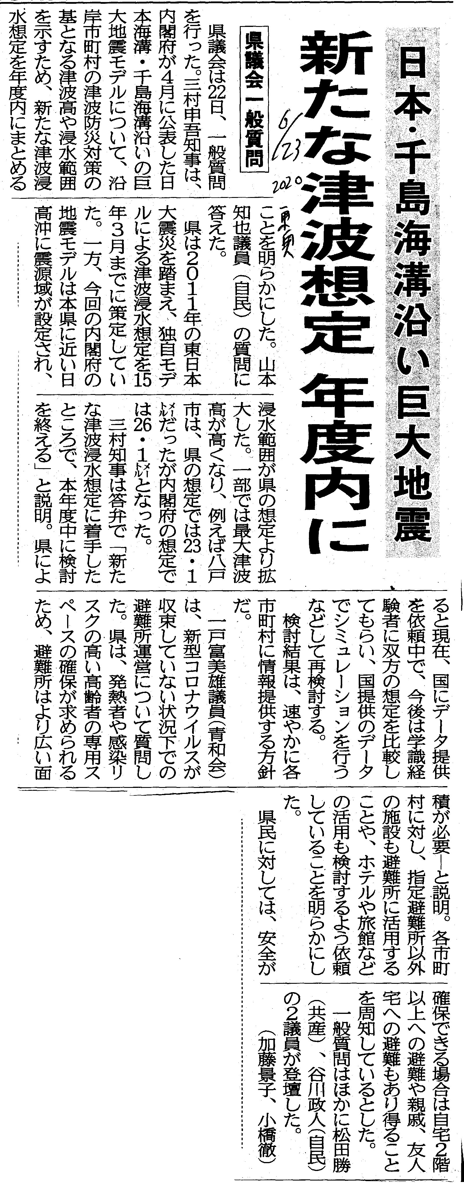 [2020_06_23_08]日本・千島海溝沿い巨大地震 新たな津波想定 年度内に 県議会一般質問(東奥日報2020年6月23日)
