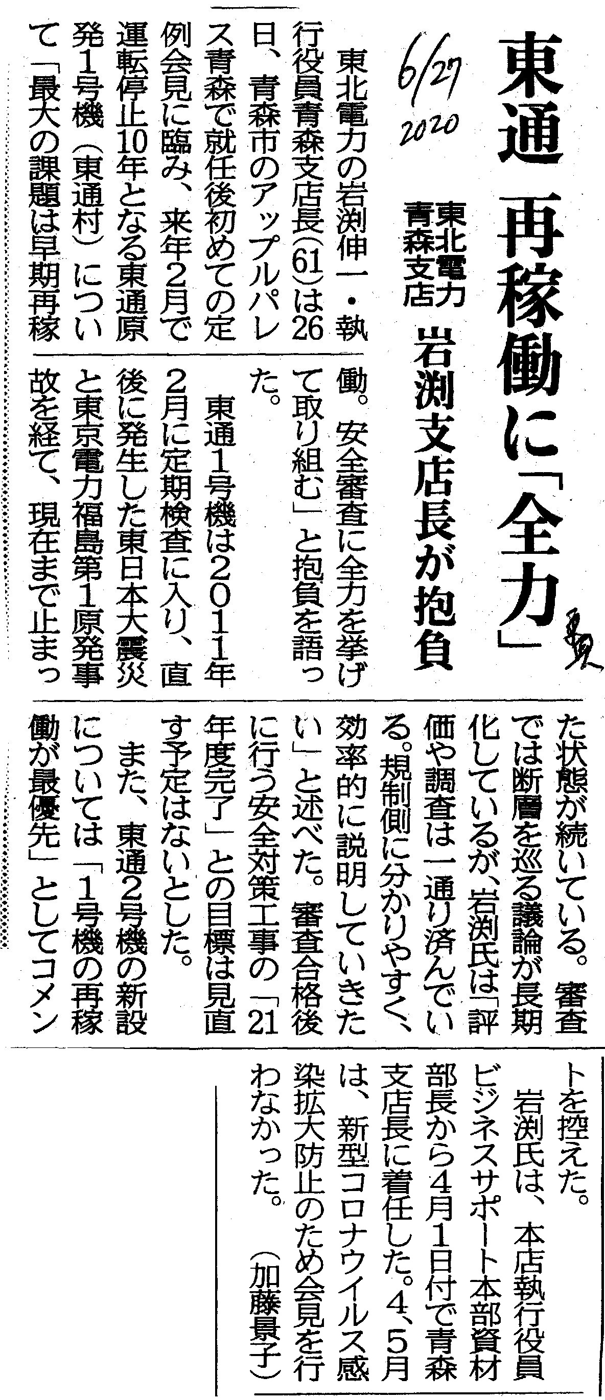 | [2020_06_27_02]東通 再稼働に「全力」 東北電力青森支店 岩渕支店長が抱負(東奥日報2020年6月27日) |