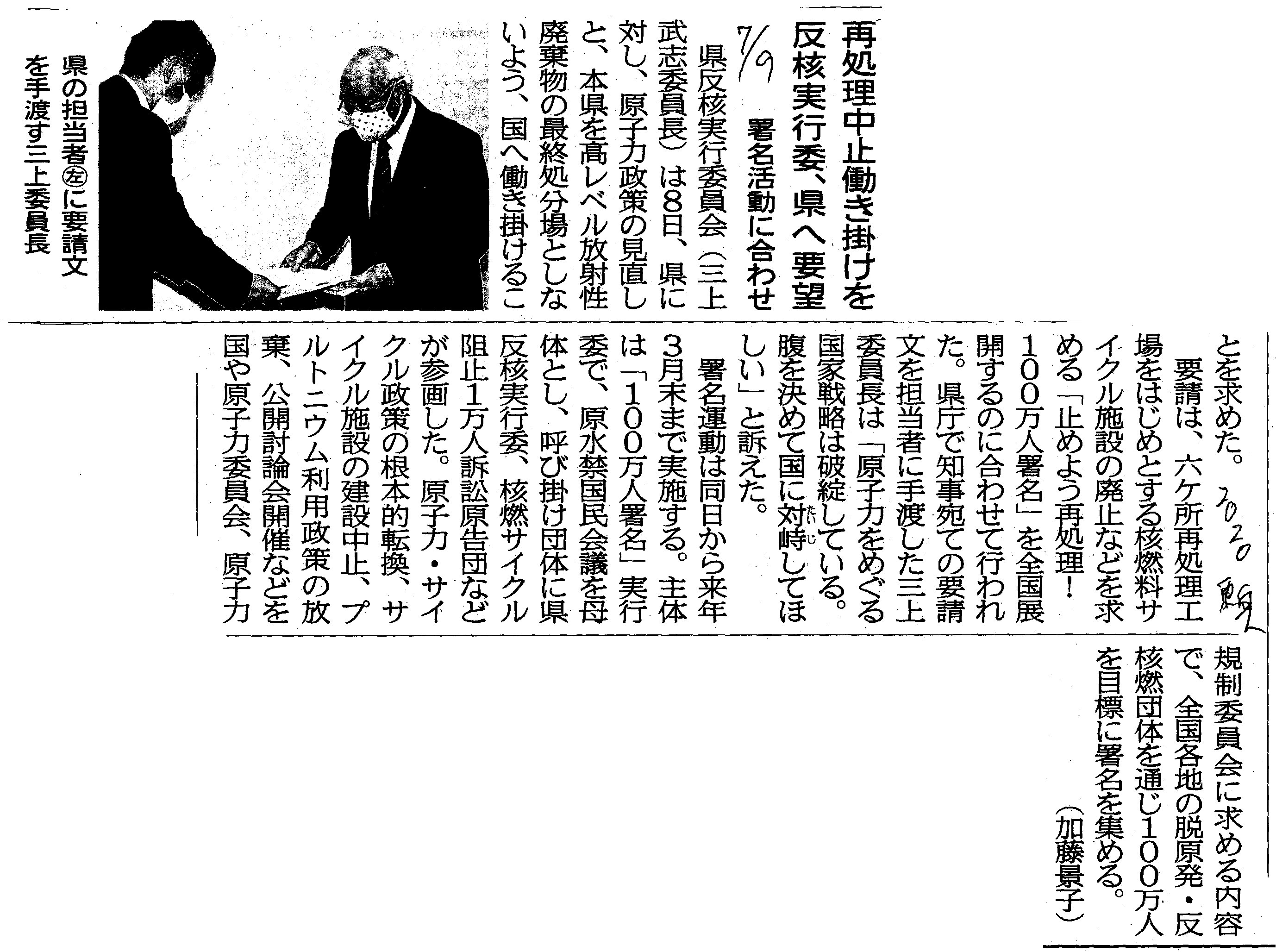 | [2020_07_09_04]再処理中止働き掛けを 反核実行委、県へ要望 署名活動に合わせ(東奥日報2020年7月9日) |