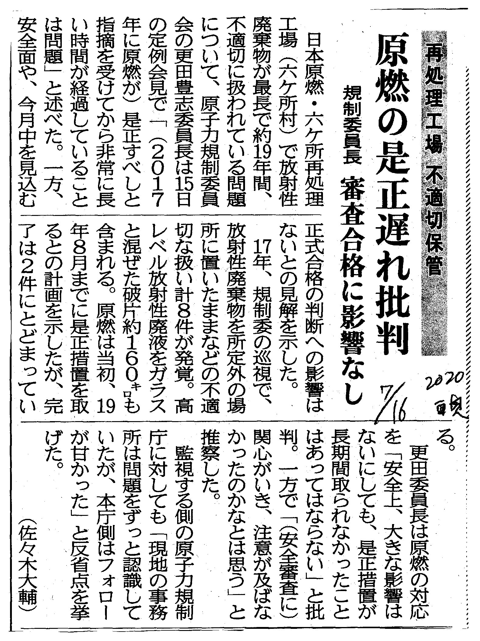 | [2020_07_16_06]再処理工場 不適切保管 原燃の是正遅れ批判 規制委員長 審査合格に影響なし(東奥日報2020年7月16日) |
