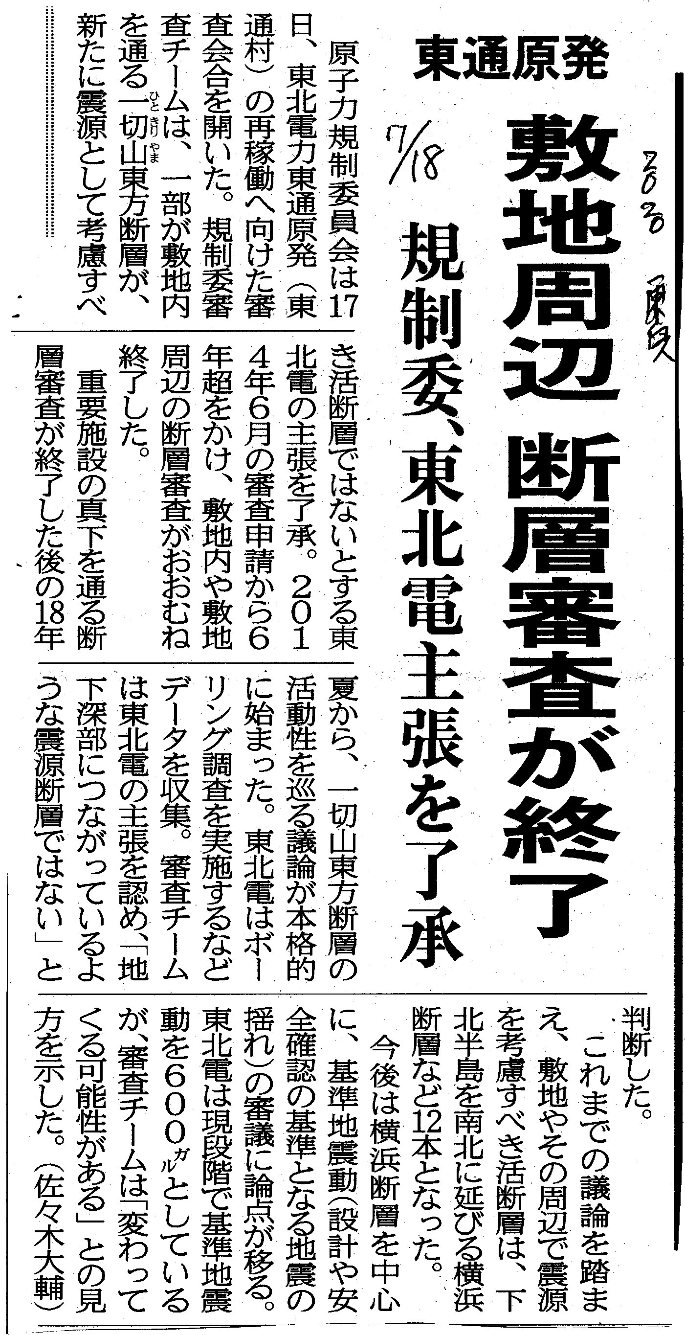 | [2020_07_18_05]東通原発 敷地周辺 断層審査が終了 規制委、東北電主張を了承(東奥日報2020年7月18日) |