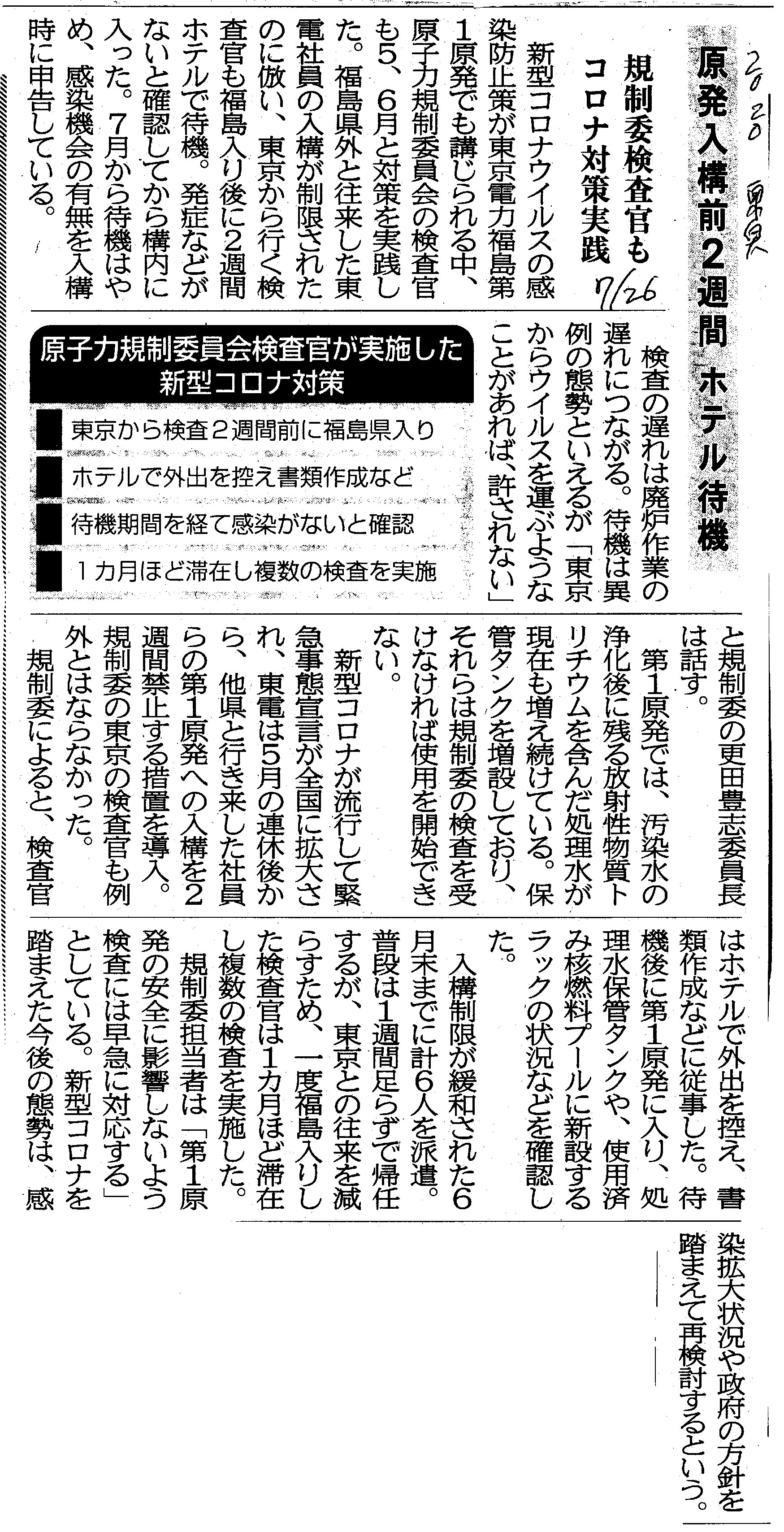 [2020_07_26_01]原発入構前2週間 ホテル待機 規制委検査官もコロナ対策実践(東奥日報2020年7月26日)