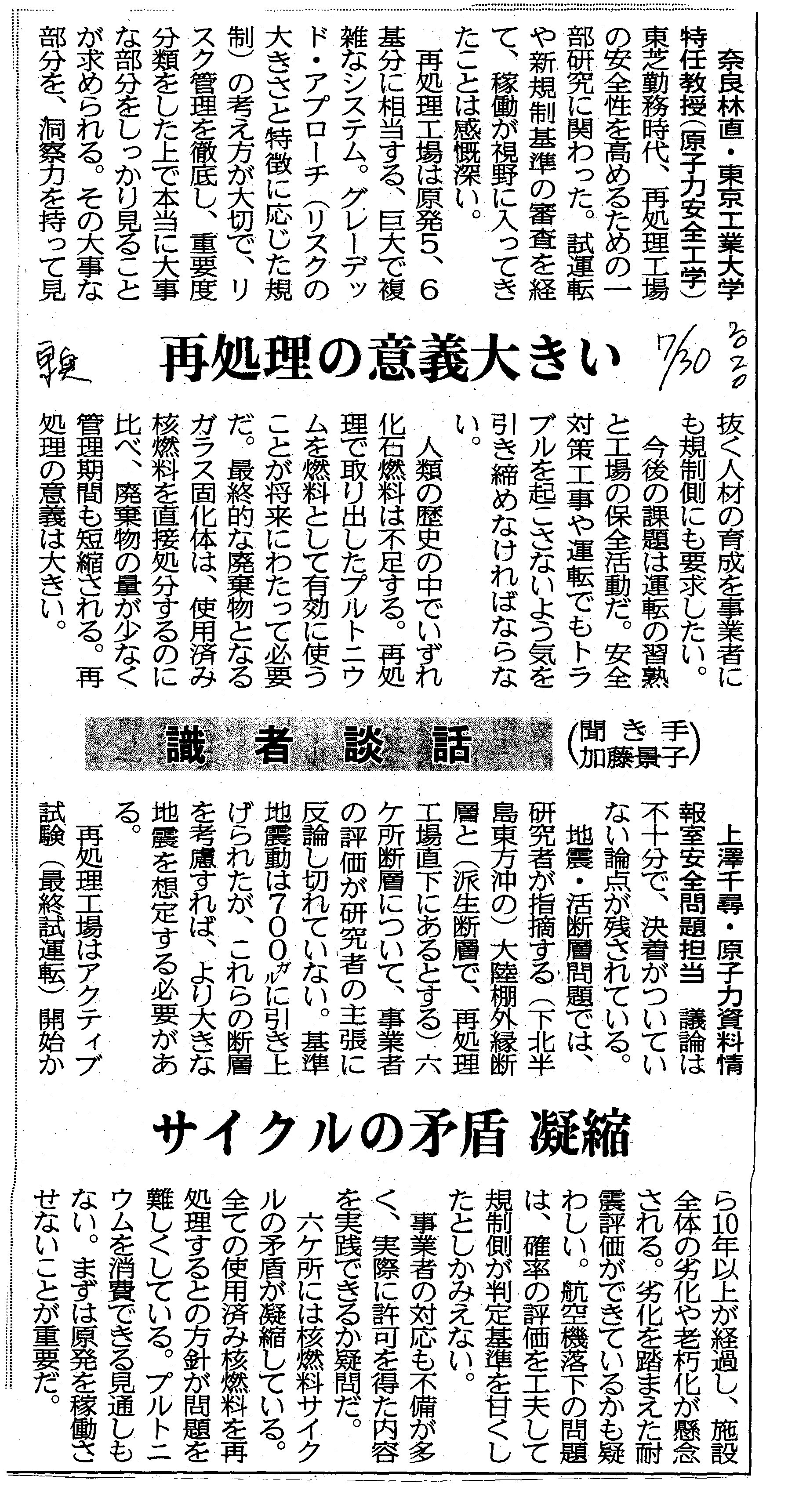 | [2020_07_30_07]識者談話 再処理の意義大きい 奈良林直・東京工業大学特任教授(原子力安全工学) サイクルの矛盾 凝縮 上澤千尋・原子力資料情報室安全問題担当(東奥日報2020年7月30日) |