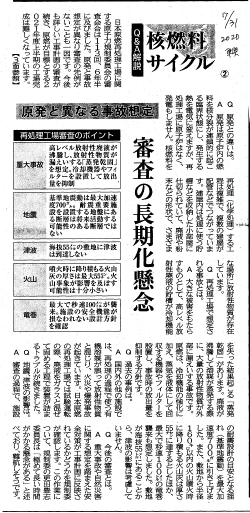 | [2020_07_31_06]核燃サイクル Q&A解説(2) 原発と異なる事故想定 審査の長期化懸念(東奥日報2020年7月31日) |