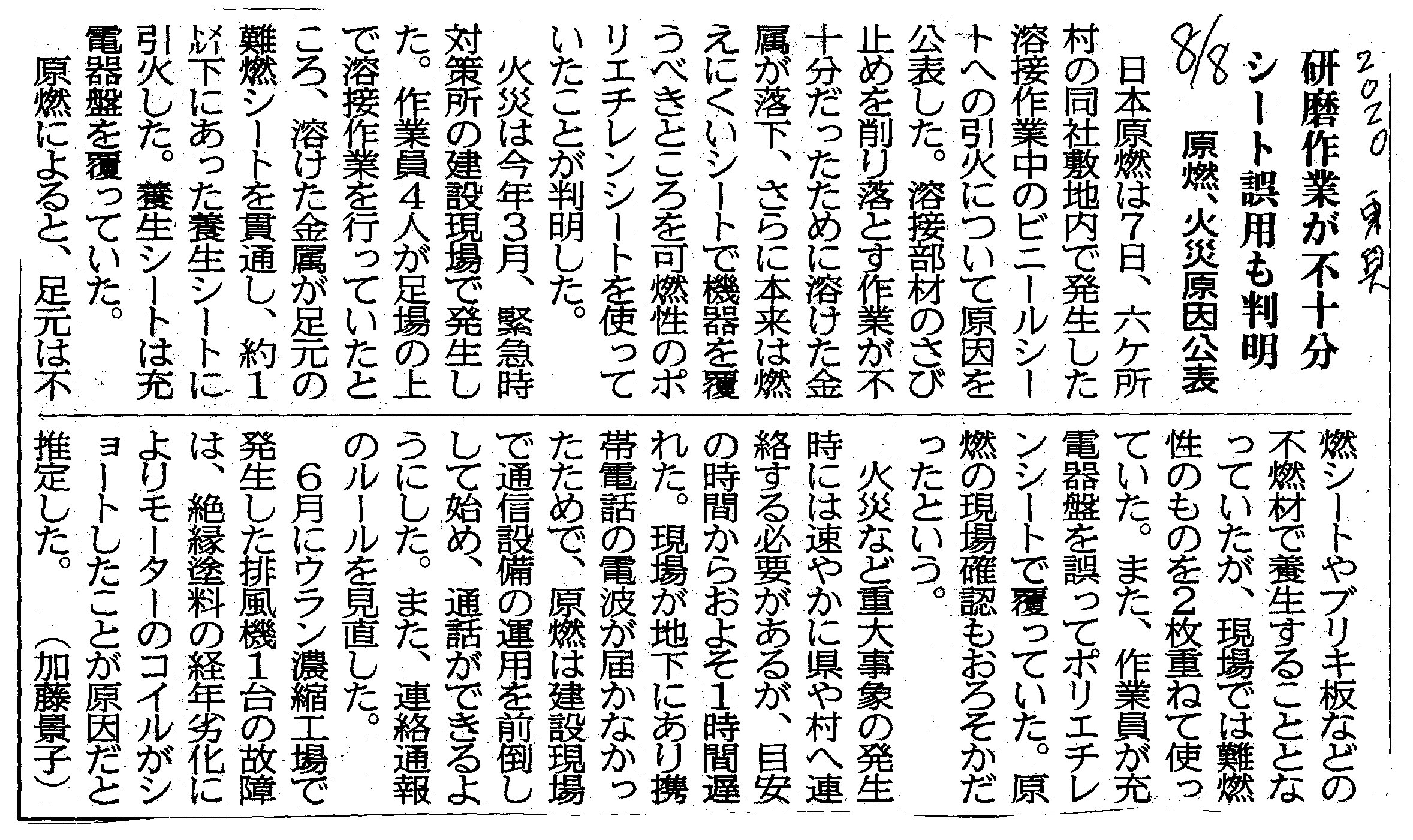 | [2020_08_08_04]研磨作業が不十分 シート誤用も判明 原燃、火災原因公表(東奥日報2020年8月8日) |
