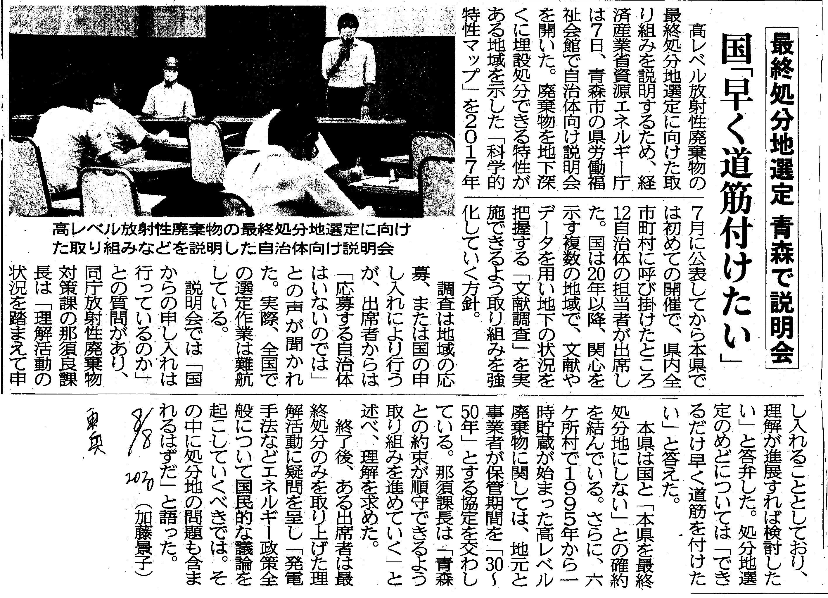[2020_08_08_05]最終処分地選定 青森で説明会 国「早く道筋付けたい」(東奥日報2020年8月8日)