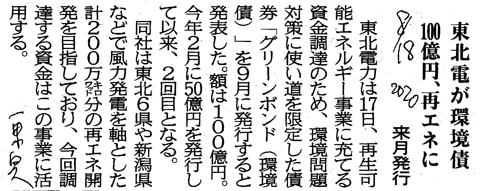 [2020_08_18_07]東北電が環境債 100億円、再エネに 来月発行(東奥日報2020年8月18日)