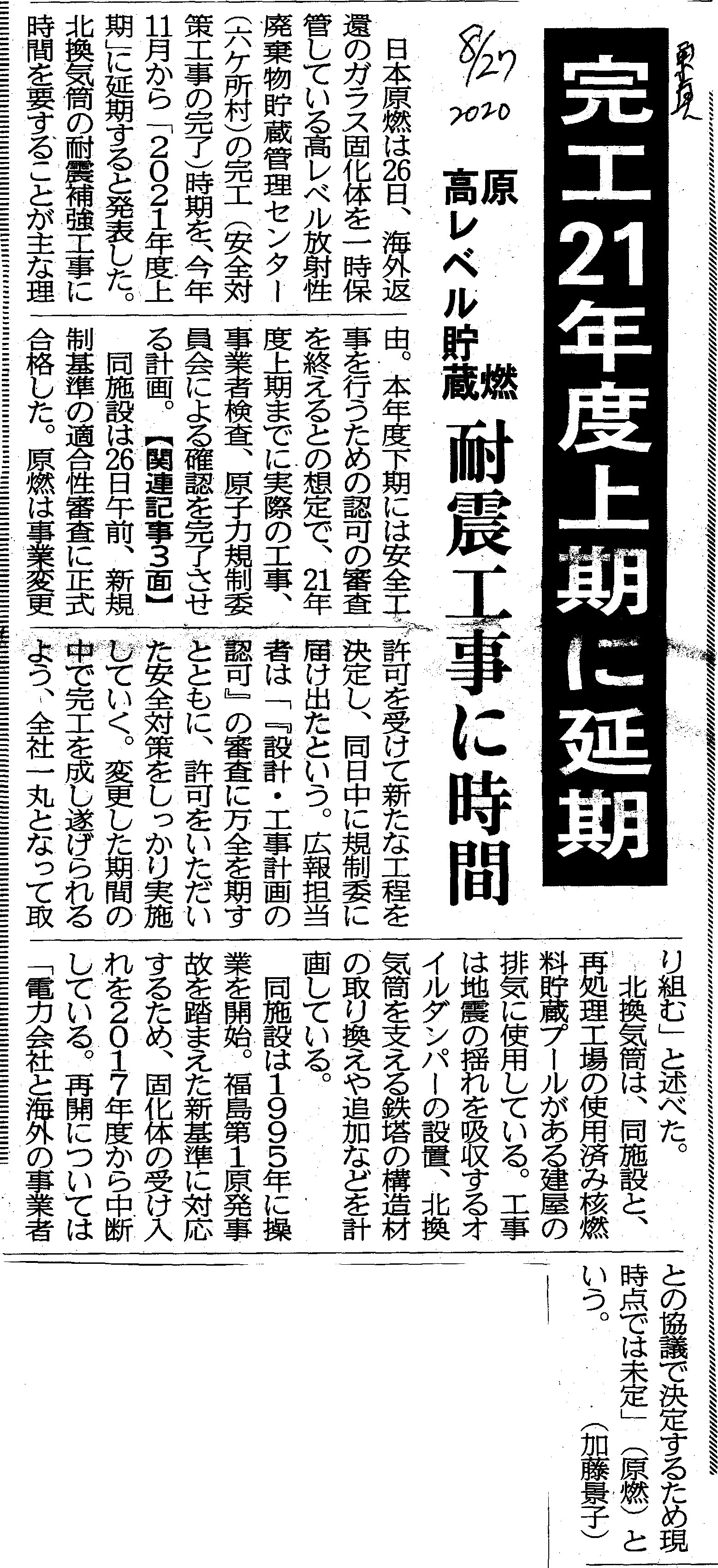 [2020_08_27_06]完工21年度上期に延期 原燃高レベル貯蔵 耐震工事に時間(東奥日報2020年8月27日)