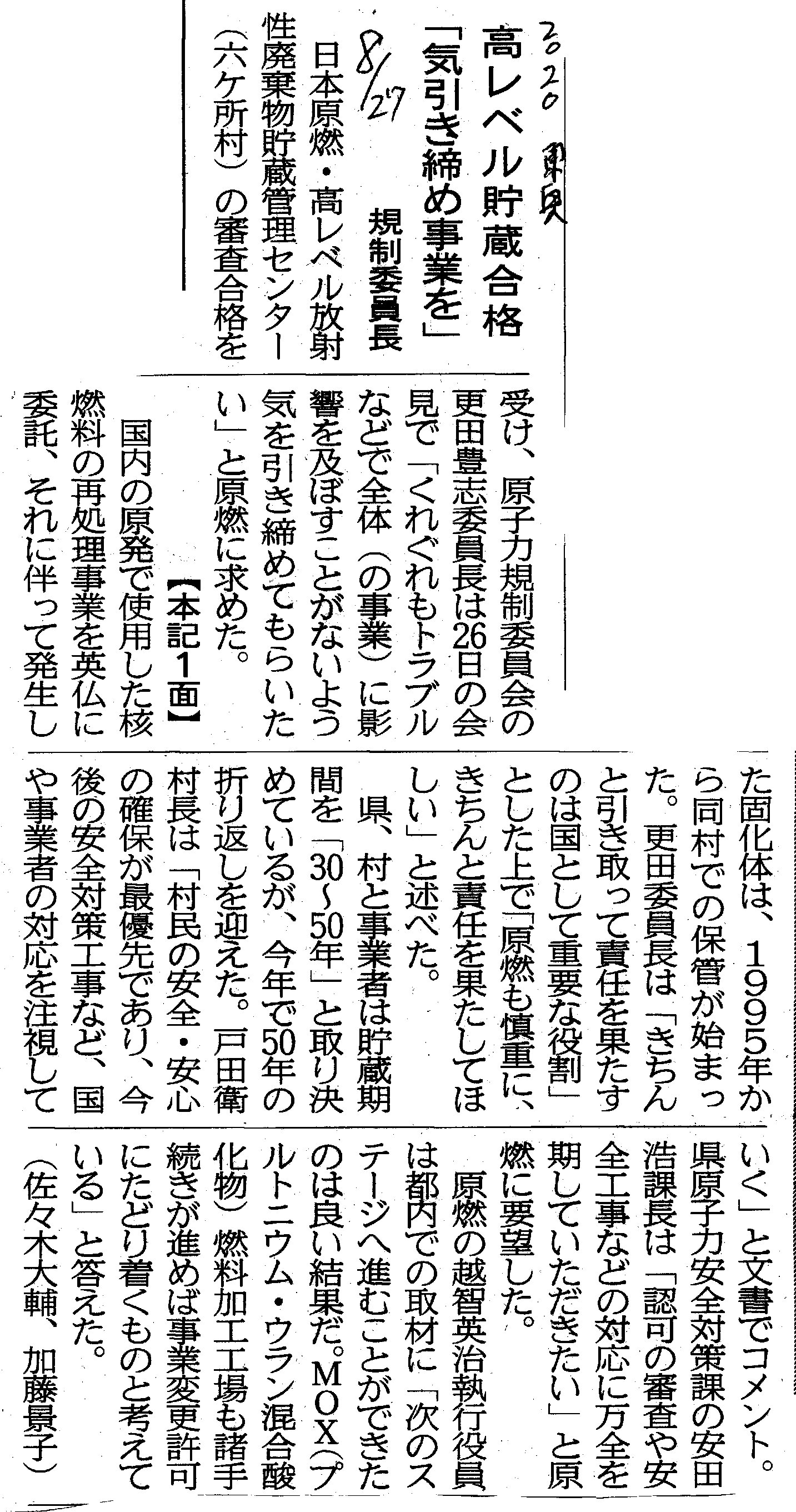 | [2020_08_27_07]高レベル貯蔵合格「気を引き締め事業を」 規制委員長(東奥日報2020年8月27日) |