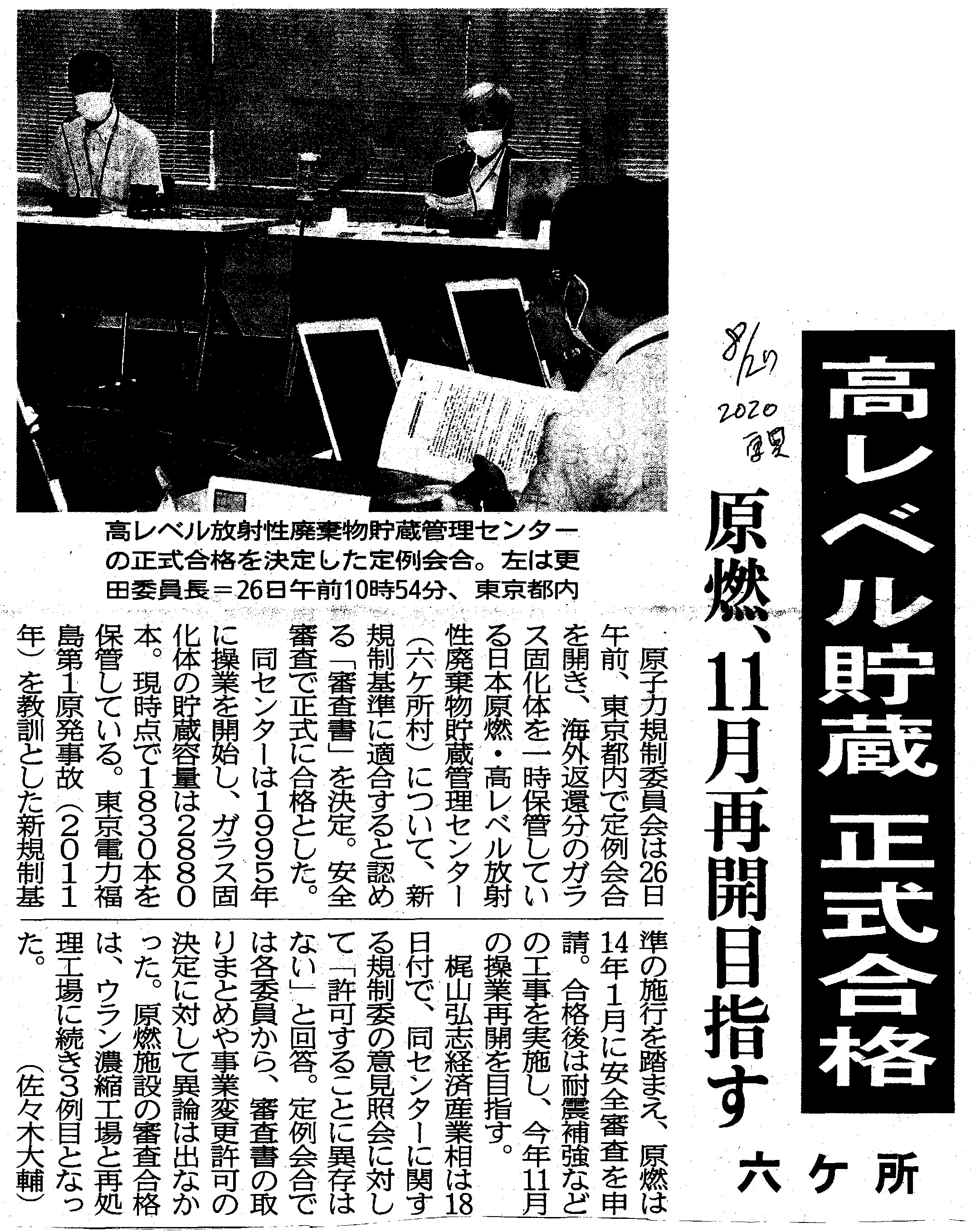 | [2020_08_27_08]高レベル貯蔵 正式合格 原燃、11月再開目指す 六ケ所(東奥日報2020年8月27日) |