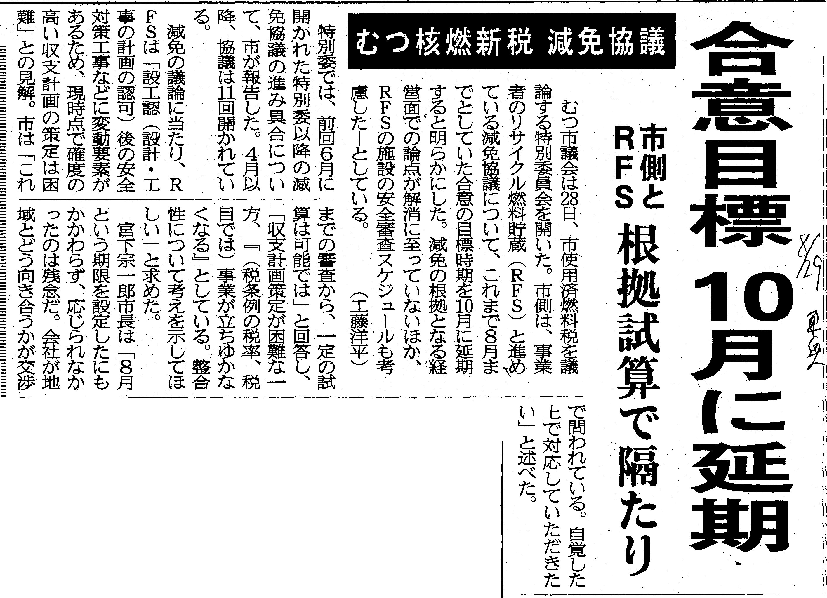 | [2020_08_29_01]むつ核燃新税 減免協議 合意目標 10月に延期 市側とRFS 根拠試算で隔たり(東奥日報2020年8月29日) |