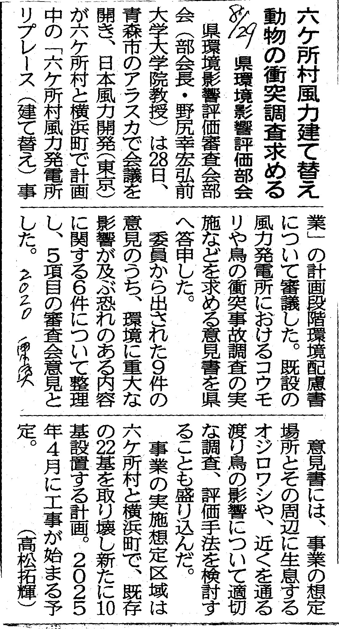 [2020_08_29_02]六ケ所村風力建て替え 動物の衝突調査求める 県環境影響評価部会(東奥日報2020年8月29日)
