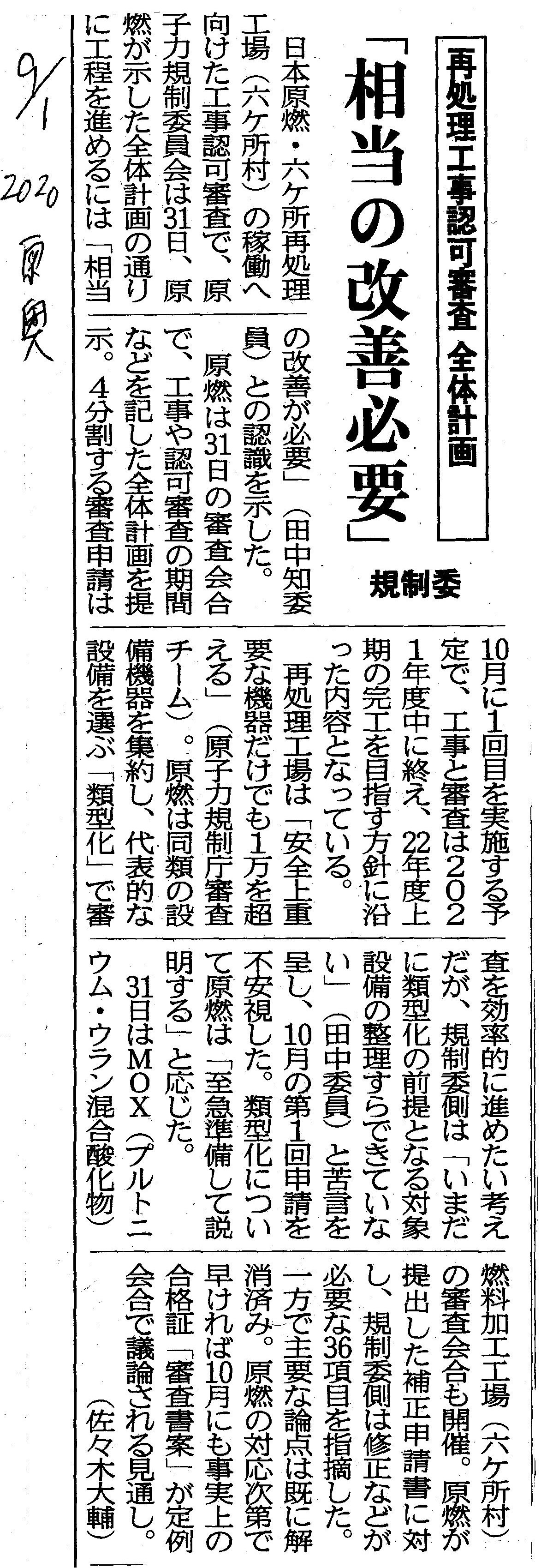 [2020_09_01_05]再処理工場認可審査 全体計画 「相当の改善必要」 規制委(東奥日報2020年9月1日)