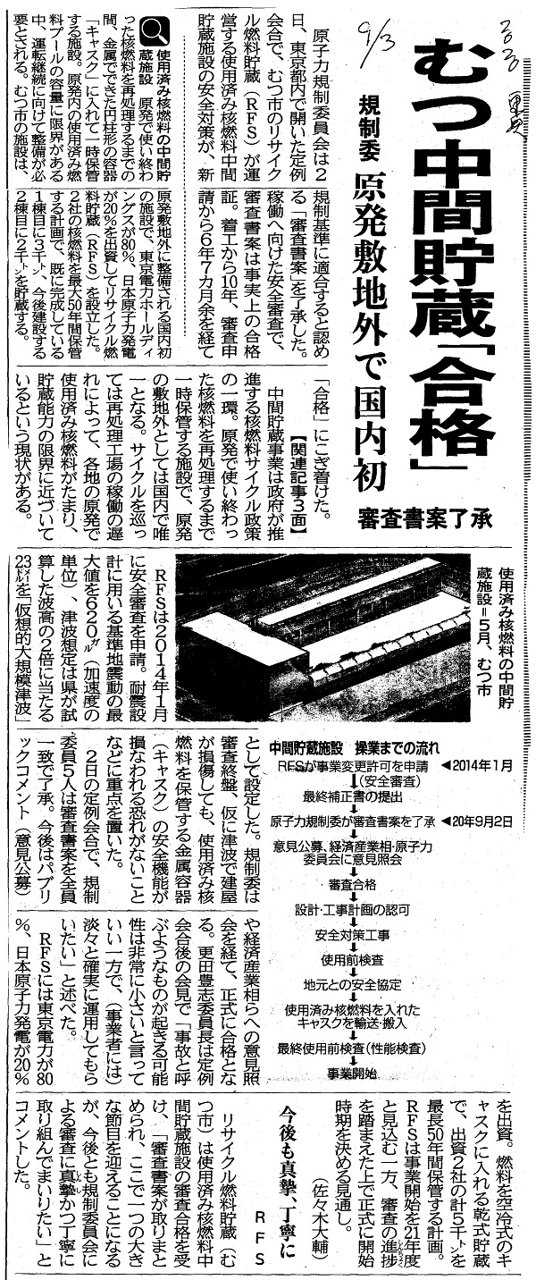 | [2020_09_03_07]むつ中間貯蔵「合格」 規制委 原発敷地外で国内初 審査書案了承 今後も真摯、丁寧に RFS(東奥日報2020年9月3日) |