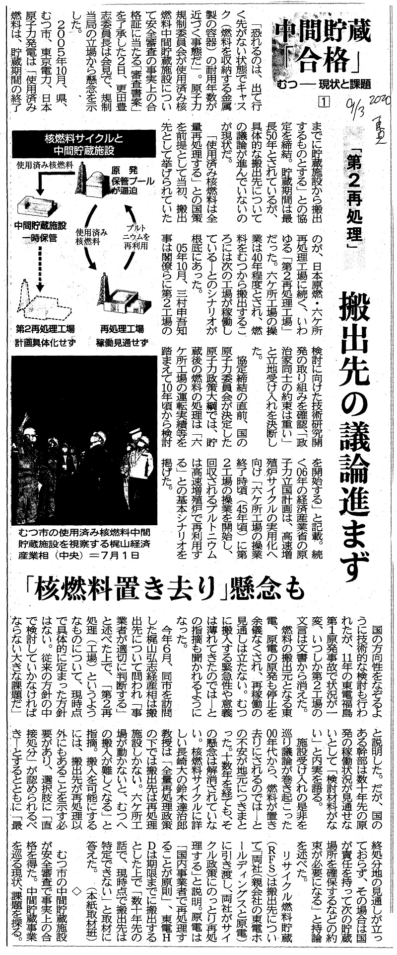 | [2020_09_04_07]中間貯蔵「合格」 むつ−現状と課題(1) 「第2再処理」 搬出先の議論進まず 「核燃料置き去り」懸念も(東奥日報2020年9月4日) |
