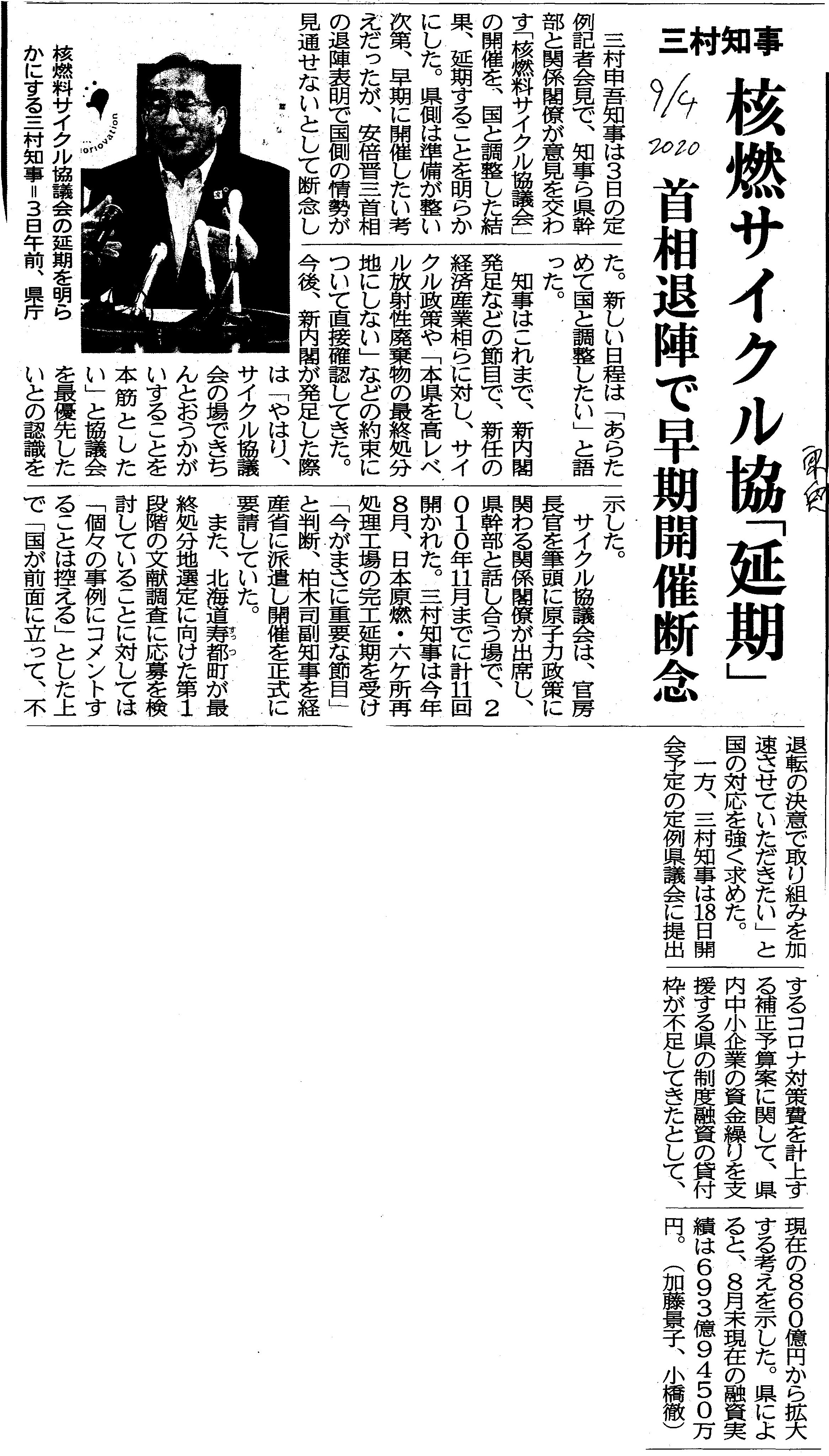 | [2020_09_04_09]三村知事 核燃サイクル協「延期」 首相退陣で早期開催断念(東奥日報2020年9月4日) |