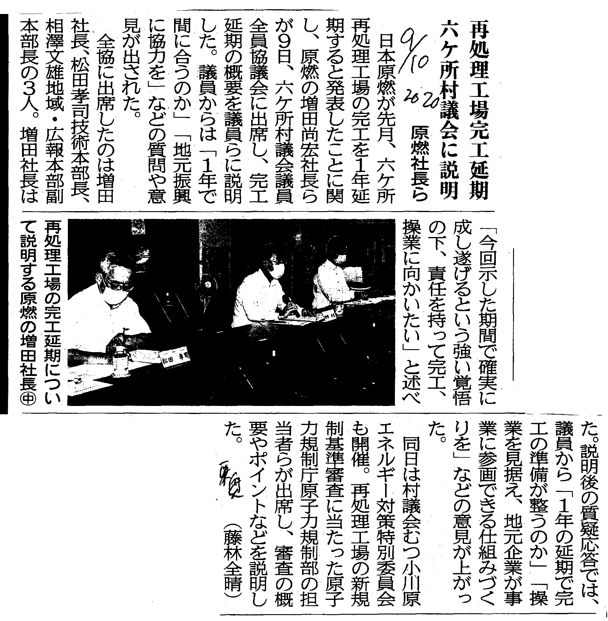 [2020_09_10_01]再処理工場完工延期 六ケ所村議会に説明 原燃社長ら(東奥日報2020年9月10日)