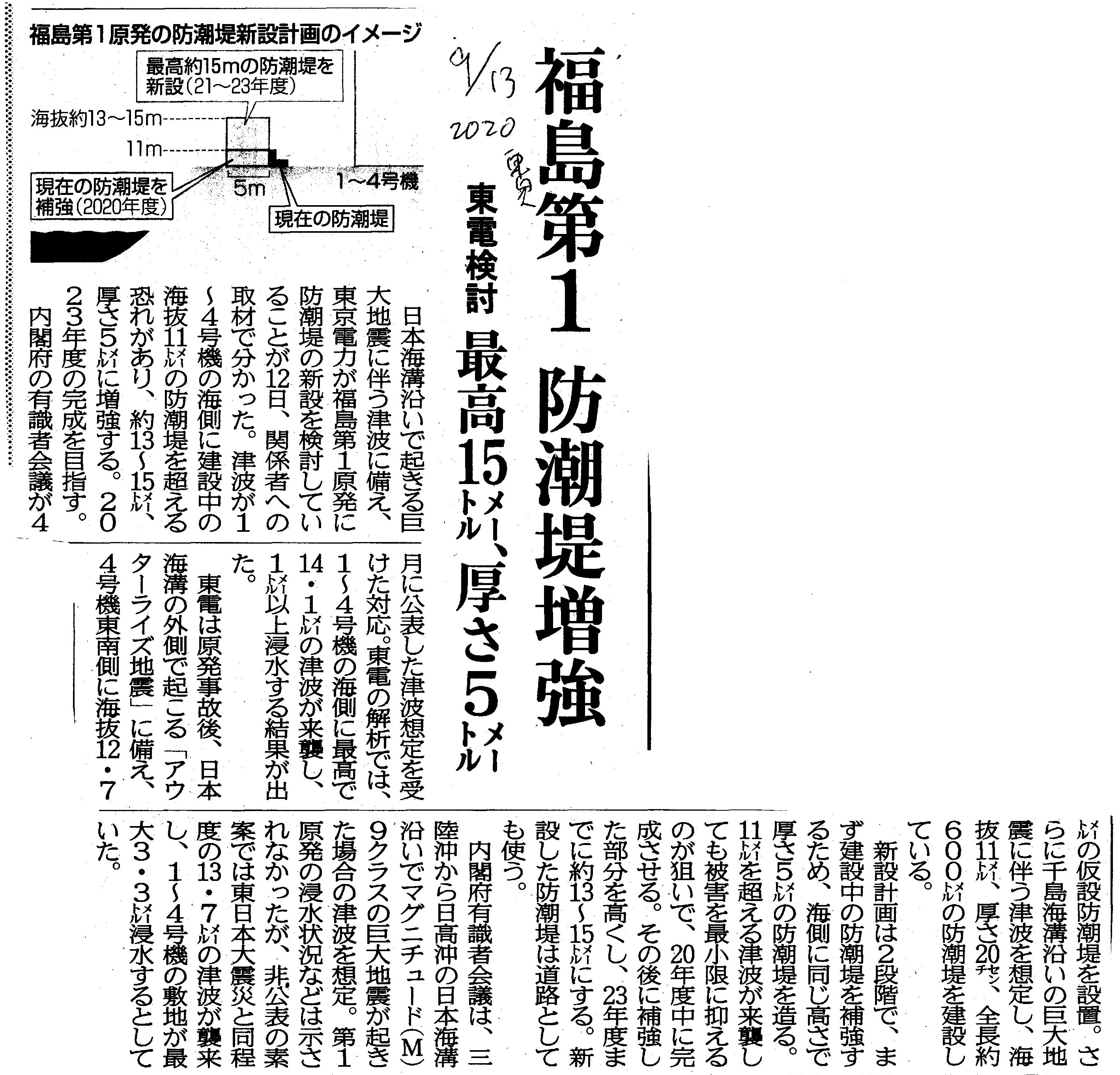 | [2020_09_13_01]福島第1 防潮堤増強 東電検討 最高15メートル 厚さ5メートル(東奥日報2020年9月13日) |