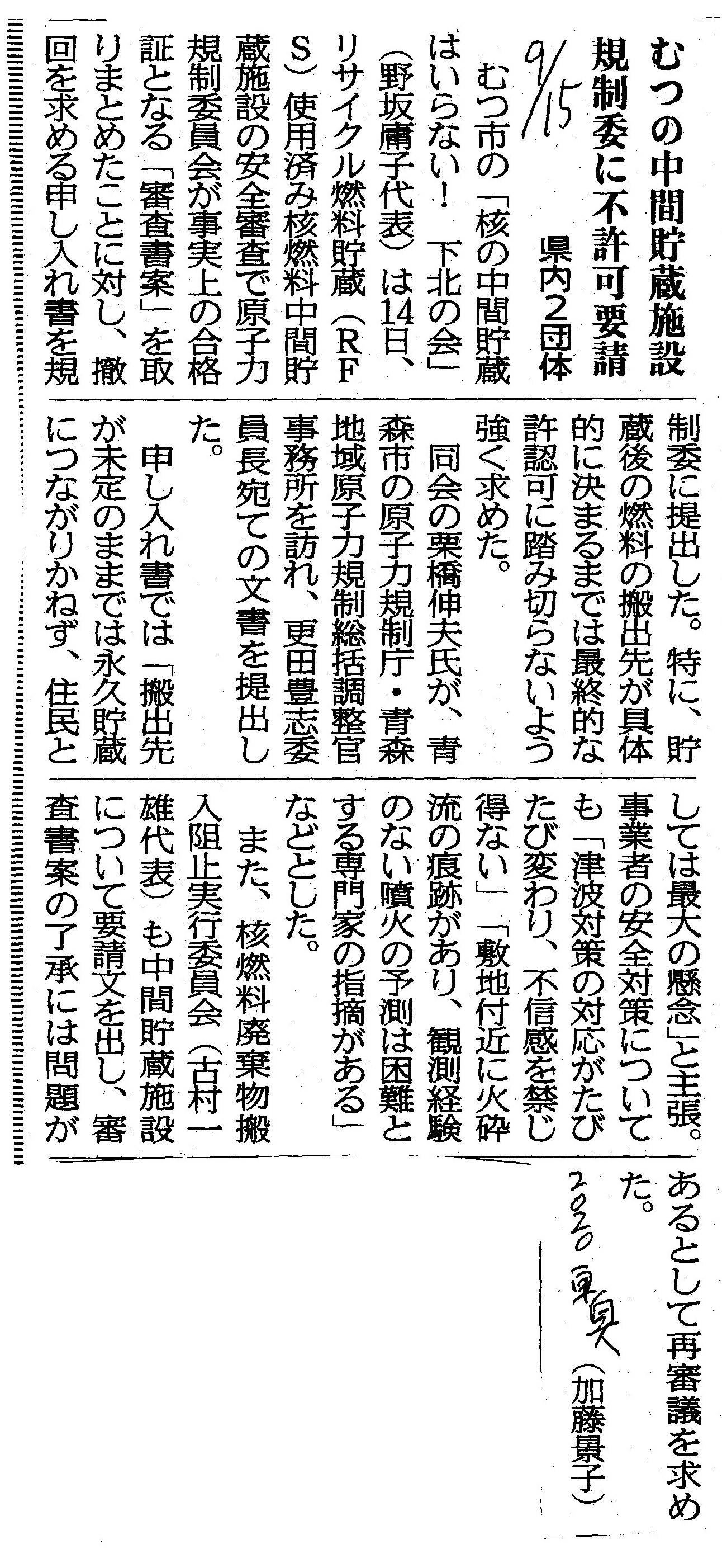 | [2020_09_15_07]むつの中間貯蔵施設 規制委に不許可要請 県内2団体(東奥日報2020年9月15日) |