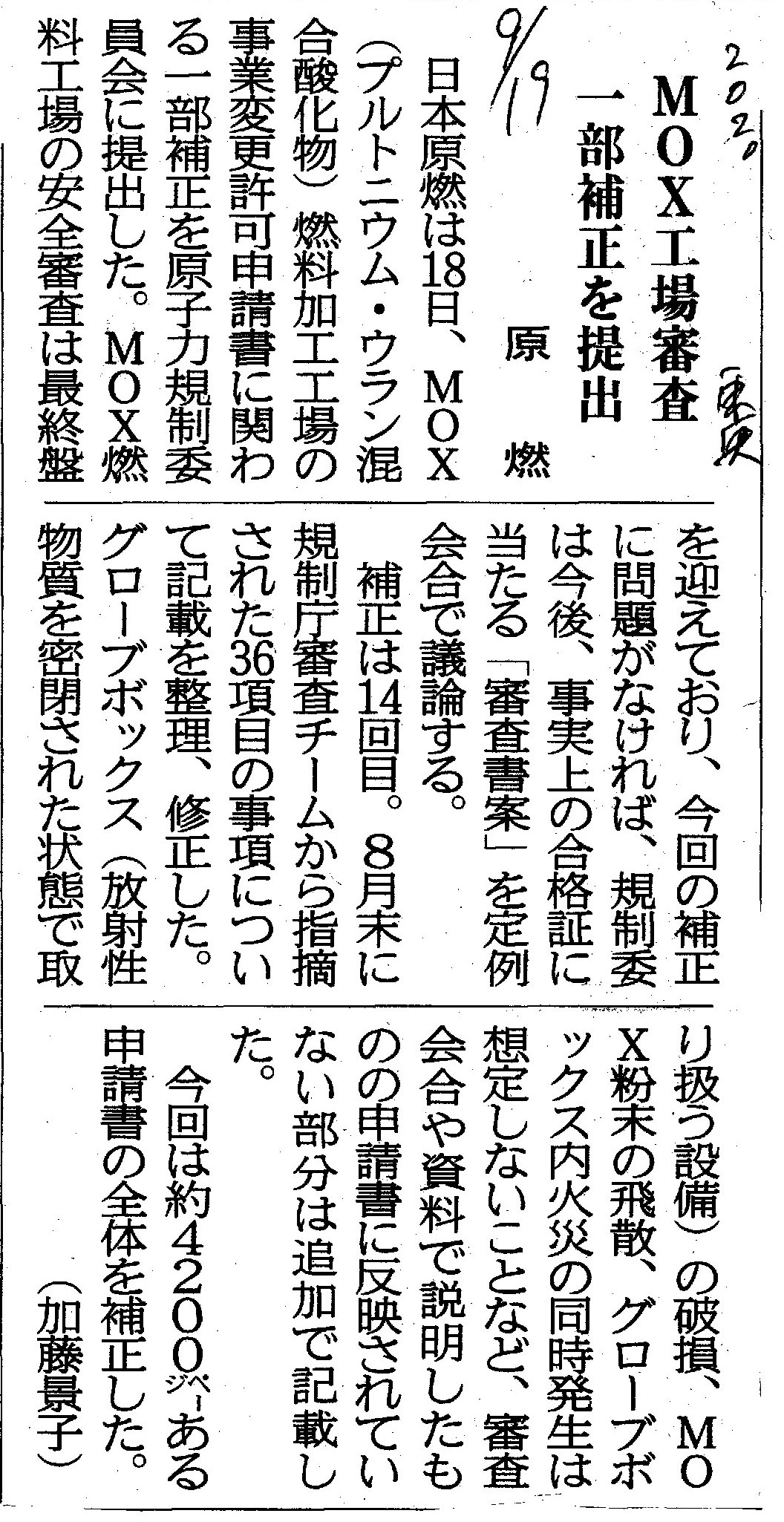 [2020_09_19_07]MOX工場審査 一部補正を提出 原燃(東奥日報2020年9月19日)