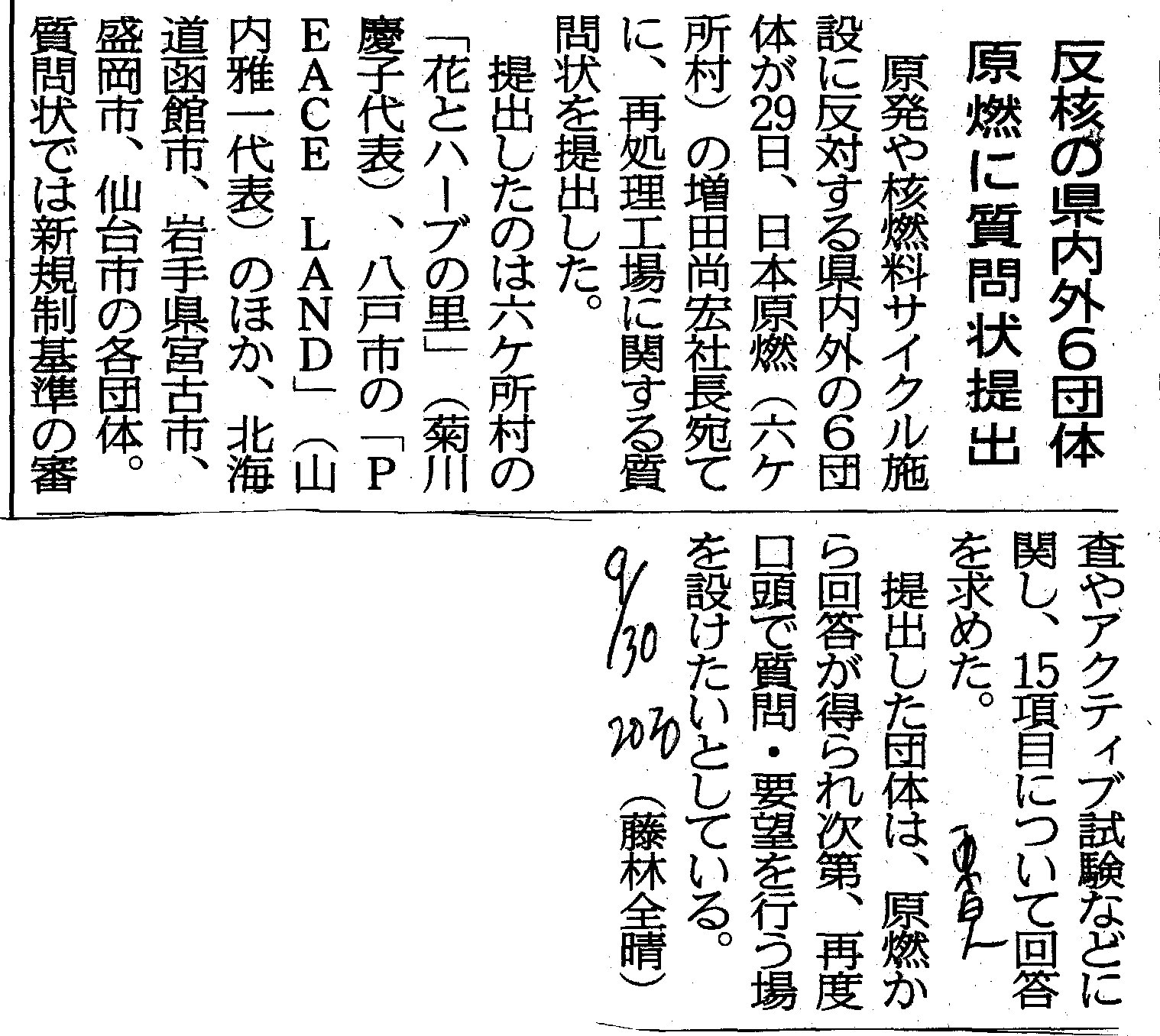 | [2020_09_30_06]反核の県内外6団体 原燃に質問状提出(東奥日報2020年9月30日) |