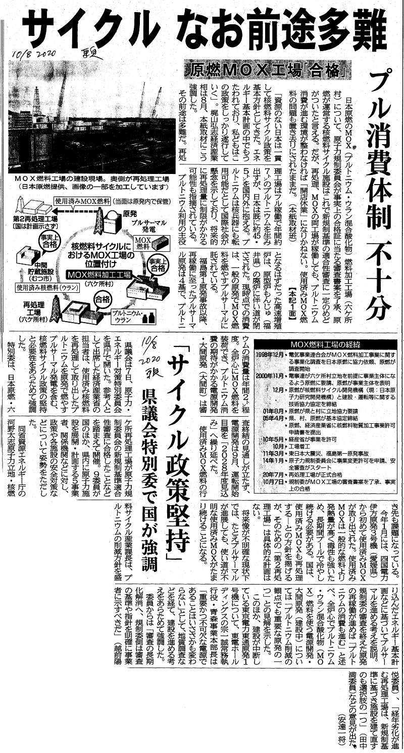 | [2020_10_08_09]サイクル なお前途多難 原燃MOX工場「合格」 プル消費体制 不十分 「サイクル政策堅持」 県議会特別委で国が強調(東奥日報2020年10月8日) |