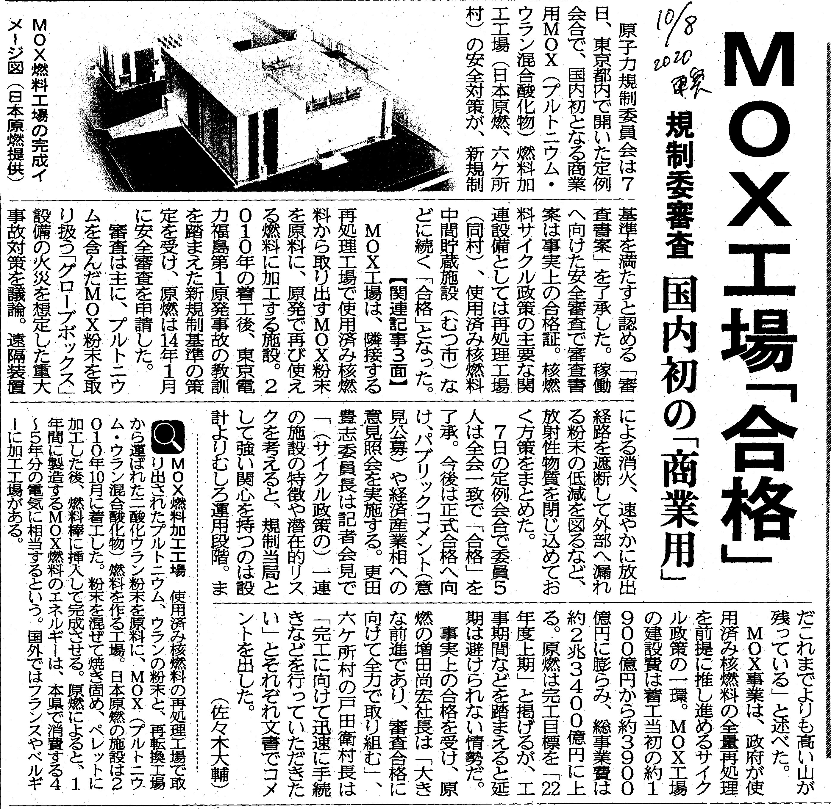 | [2020_10_08_10]MOX工場「合格」 規制委審査 国内初の「商業用」(東奥日報2020年10月8日) |