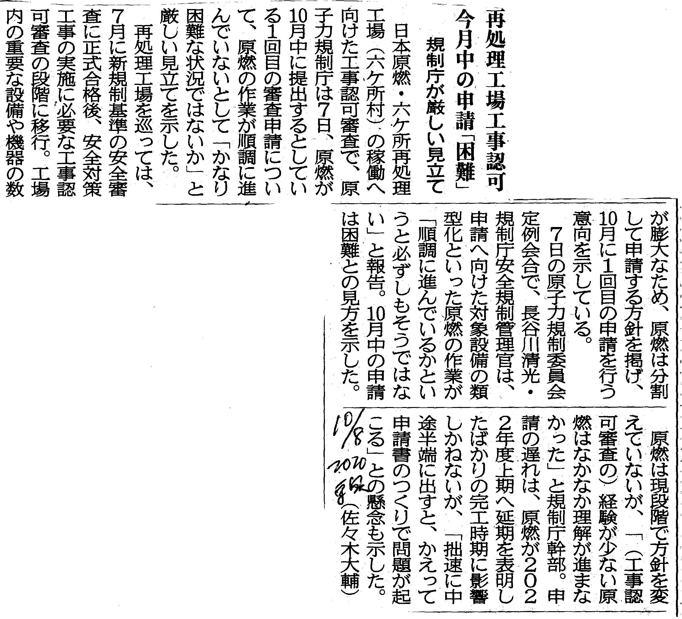 | [2020_10_08_11]再処理工場工事認可 今月中の申請「困難」 規制庁が厳しい見立て(東奥日報2020年10月8日) |